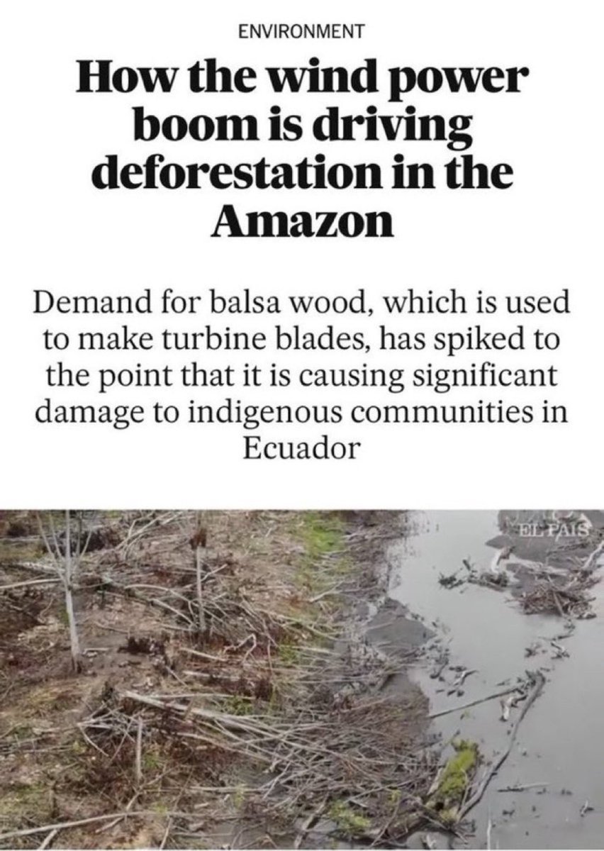 Balsa wood is used as a key component in the construction of wind turbine blades. The Amazon rainforest โ the lungs of the Earth, is plundered & stripped to supply balsa wood for wind turbines - with a devastating impact on the indigenous peoples of the Ecuadorian Amazon. https://t.co/KHfRrg51p9