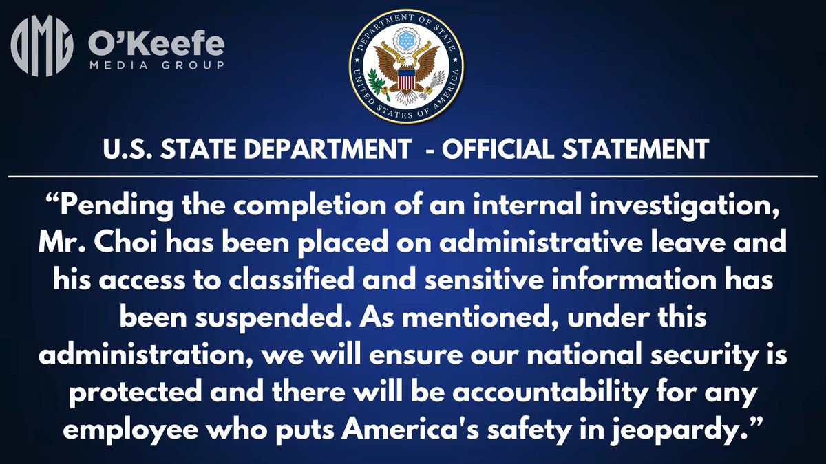 JUST IN: The @StateDept confirms Foreign Service Officer Daniel Choi has been placed on administrative leave and stripped of access to classified information pending an internal investigation. This follows OMG’s reporting that Choi dated the daughter of a senior CCP official, admitted “She could have been a spy,” and refused to report her. A senior State Department official says they will “ensure our national security is protected” and hold accountable “any employee who puts America’s safety in jeopardy.” We will continue to update as the story unfolds. @SecRubio @DOGE_STATE