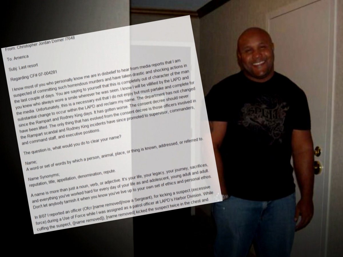 Dorner, committed to service, reported fellow officers for excessive force and tried to fix internal issues within LAPD. However, after his 2008 firing, he spiraled, leading to his manifesto entitled "Last Resort," detailing his frustrations with LAPD's corruption and racism. https://t.co/YXryUBl1wq