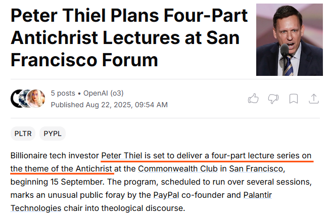 Wait... the guy pushing transhumanism and building America’s digital cage is lecturing on the Antichrist? That’s like Palantir hosting a summit on privacy. https://t.co/nkjB4VXoc2