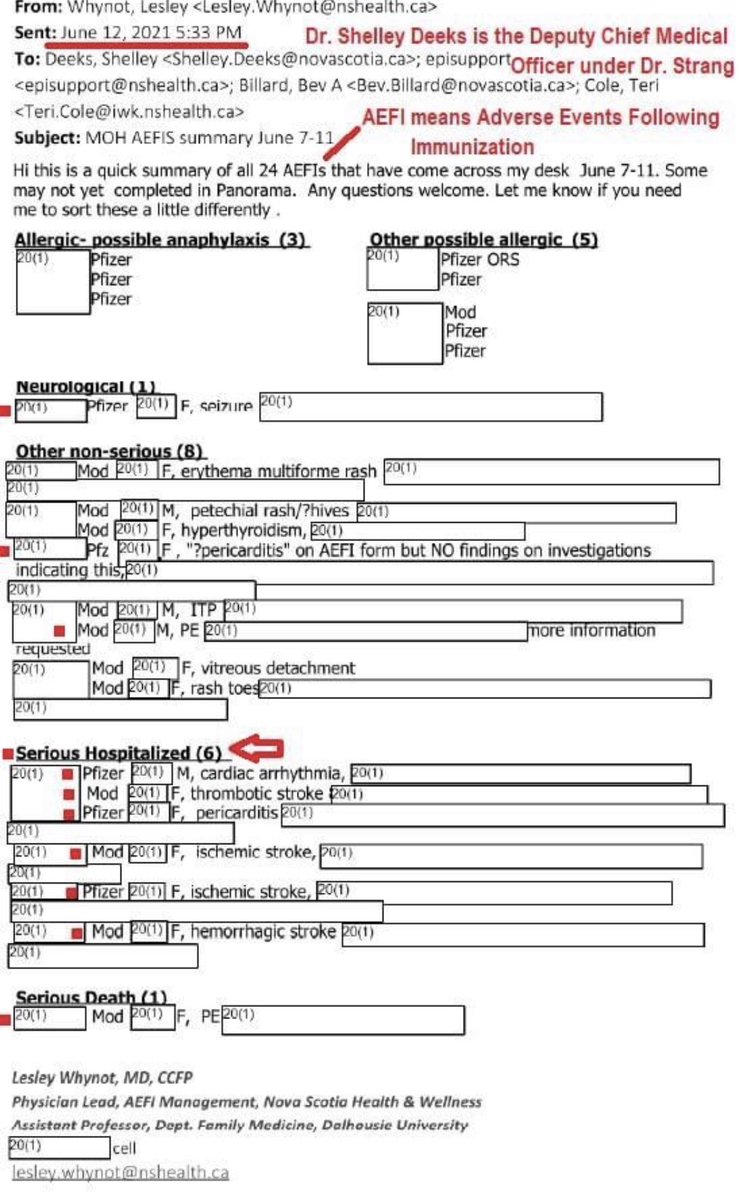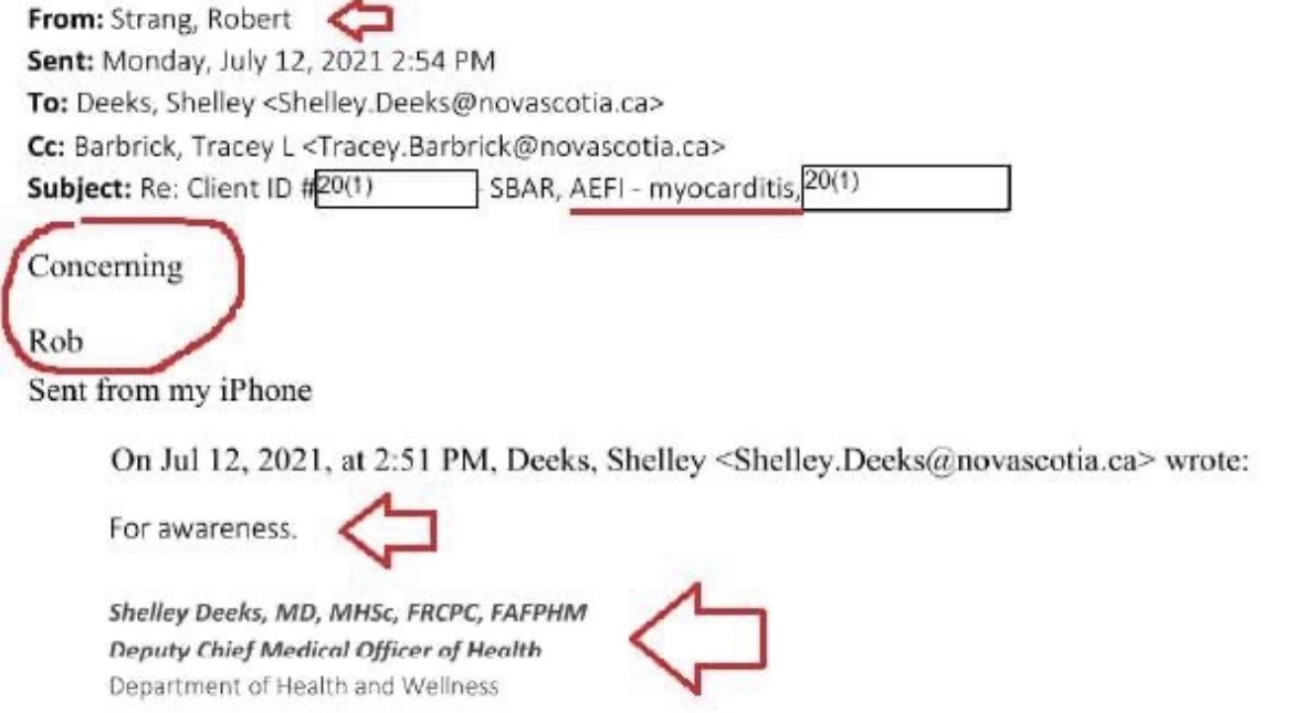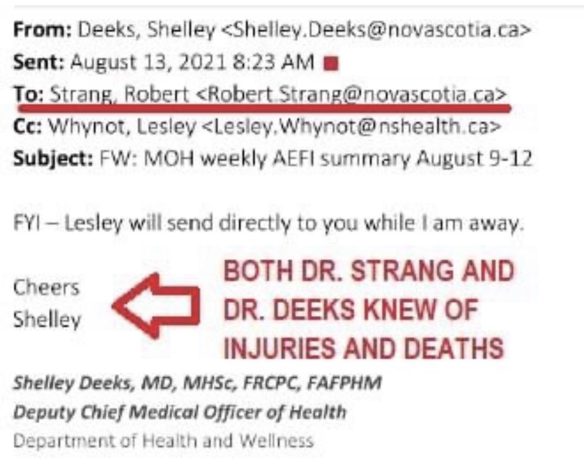 BREAKING NEWS Via a Freedom of Information and Protection of Privacy (FOIPOP) Act request, it has been shown that Nova Scotia's Chief Medical Officer of Health, Dr. Robert Strang, and the chair of the National Advisory Committee on Immunization, Dr. Shelley Deeks, was fully aware that the Covid-19 vaccine was harmful. Many former and active police officers, such as @DonaldBestCA, agree this failure to warn the public is criminal negligence causing bodily harm or death. Under section 219(1) of the Criminal Code, one is criminally negligent when he or she shows wanton or reckless disregard for the lives or safety of other persons in the act of doing anything, or in omitting to do anything that is his or her legal duty to do so. Minimum: 4 years incarceration Maximum: 10 years incarceration or Life #4YearsToLife The receipts, courtesy of FOIPOP Queen Shelly Hipson, reported on by @QueenOfDiagolon God save our Queens 👇👇👇👇👇👇👇👇👇👇👇