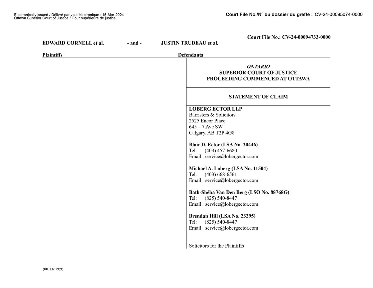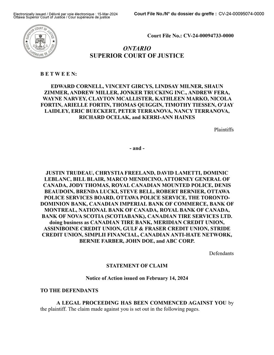 BREAKING NEWS Cornell et al. v Trudeau et al. Was Filed Today in Ontario Superior Court Today. It Is Explosive. Folks, Alberta law firm Loberg Ector LLP filed one giant step in accountability today. https://lobergector.com/emergencies-act Cornell et al. v Trudeau et al. is a legal attempt to hold several named people in the current government and several organizations accountable for the damages alleged by the plaintiffs caused by the illegal invocation of the Emergencies Act in February 2022. Entire Claim (63 Page PDF) https://img1.wsimg.com/blobby/go/9c3bcc5f-f396-4dc5-95cf-6d01da55f5f6/downloads/Statement%20of%20Claim%20(Filed)%20Cornell%20v%20Trudeau.PDF?ver=1710523480999 Justin Trudeau Among other things, is alleged to have acted unlawfully in issuing Orders in Council related to the invocation of the Emergencies Act, resulting in the unreasonable and ultra vires (beyond the powers) declaration of a public order emergency and the issuance of regulations that led to searches, seizures, and the freezing of many Canadians' bank accounts, including the plaintiffs'. Chrystia Freeland Among other things, is accused of the alleged unlawful invocation of the Emergencies Act and the issuance of related Orders in Council, which contributed to the legal and financial actions taken against the plaintiffs. Jody Thomas Among other things, is accused in the collective actions, including the alleged unlawful invocation of the Emergencies Act and the consequent financial and operational repercussions on the plaintiffs. Canadian Anti-Hate Network (CAHN) - Among other things, is accused of supplying false information and exaggerated claims to various defendants and media organizations purportedly designed to harm the plaintiffs. This information influenced the decision to invoke the Emergencies Act and contributed to the portrayal of the Ottawa Protesters, including the plaintiffs, in a negative light. The Toronto-Dominion Bank (and other banks) Among other things, alleged to have acted in breach of legislation, contract, and common law by seizing, freezing, or otherwise interfering with the financial services, private property, products, and information of the plaintiffs as part of the enforcement of the Emergencies Act's provisions. These claims are part of the broader legal action that challenges the legality and constitutionality of the Canadian government's use of the Emergencies Act in response to the Freedom Convoy protests and the subsequent impact on the plaintiffs, including financial freezes and alleged violations of constitutional rights.