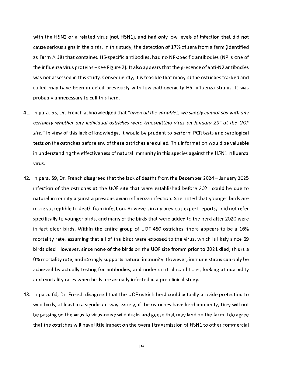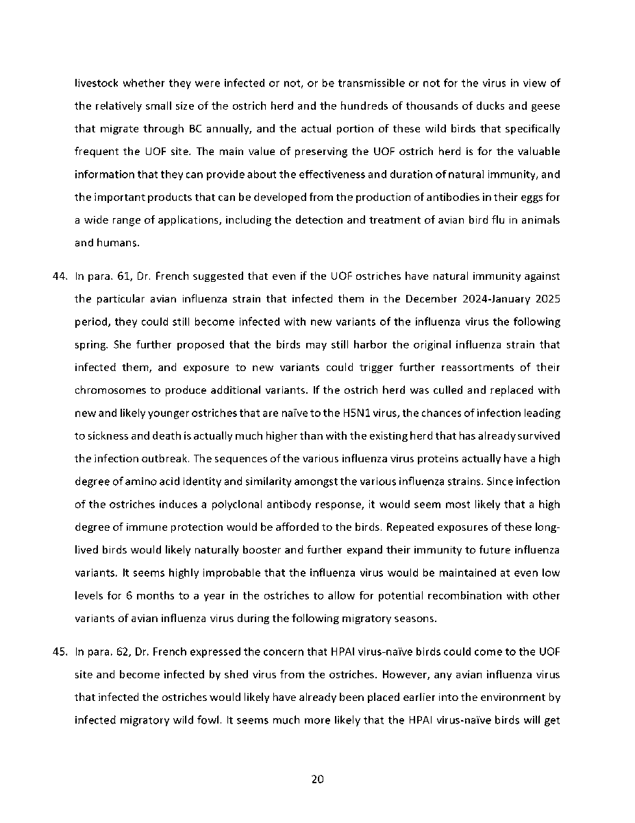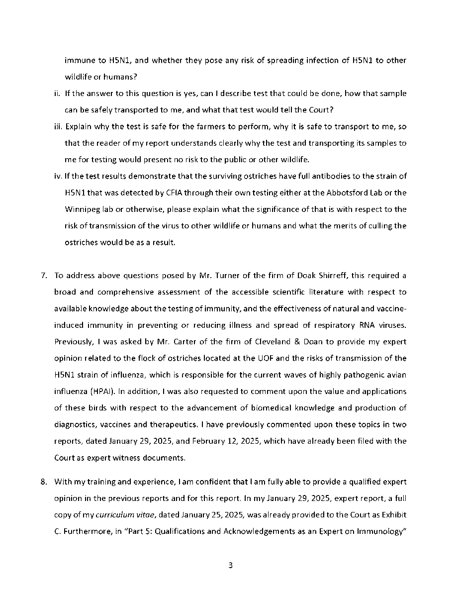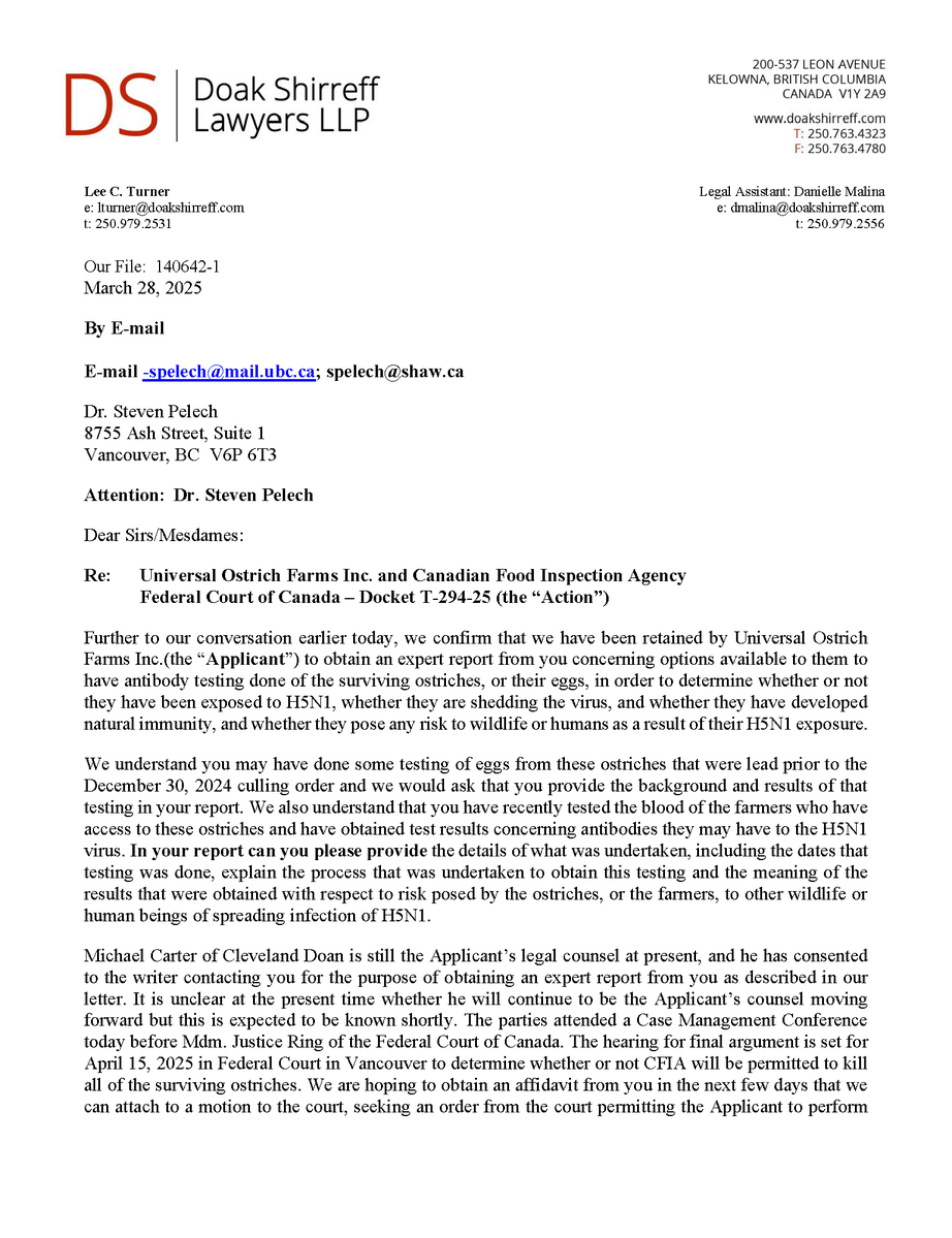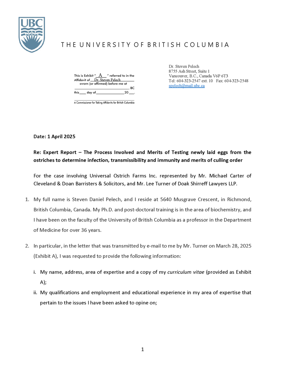 🚨 Universal Ostrich Farm Update: The Evidence the Federal Court Wouldn’t Consider!🚨 Dr. Steven Pelech, a UBC professor with 40 years of experience in immunology, submitted expert testimony demonstrating that the ostriches at Universal Ostrich Farm are healthy, immune, and scientifically valuable. Yet this evidence was denied by the Federal Court. The Birds Are Healthy Dr. Pelech confirmed that the surviving flock is not sick, is not shedding the virus, and is showing strong signs of natural immunity. Confirmed Antibodies He personally tested the eggs from these ostriches and found H5- and N1-specific antibodies in the yolks, proving the birds had recovered and developed immune protection. Research Value Ostrich eggs yield massive amounts of antibodies that can be purified for diagnostics, therapeutics, and even antiviral masks and filters. Dr. Pelech’s report outlined how this flock could advance biomedical science for animals and humans. But the Judge Said No Instead of considering this expert evidence, the Court sided with blanket CFIA policy, ignoring the law’s own provisions that allow treatment, quarantine, or research reservation instead of destruction. The takeaway? These birds are not a threat. They are a once-in-a-generation scientific asset. Culling them is not just cruel, it is a catastrophic loss for science and public health. For complete transparency, the entire 39-page expert report by Dr. Steven Pelech is attached below. Read it yourself and see the evidence the Court refused to consider.