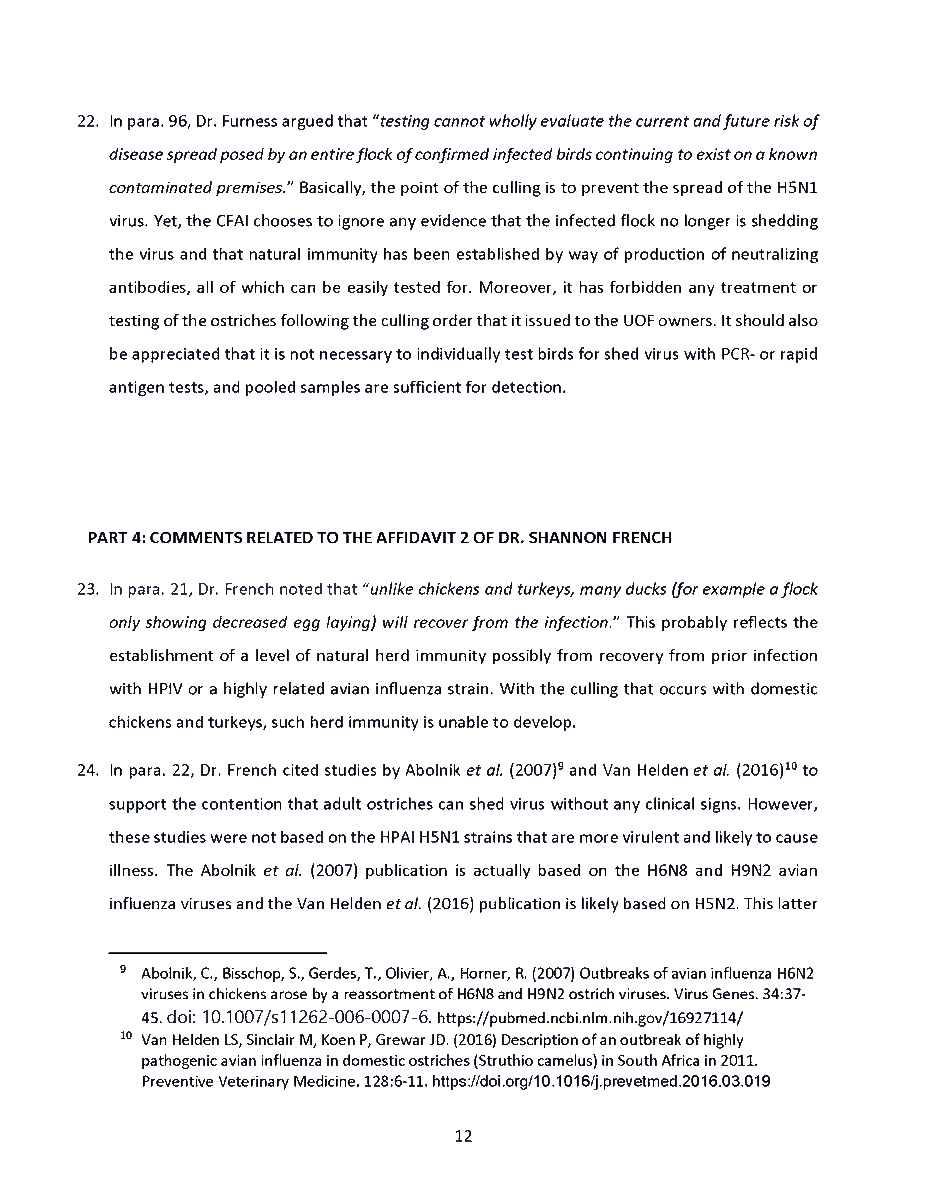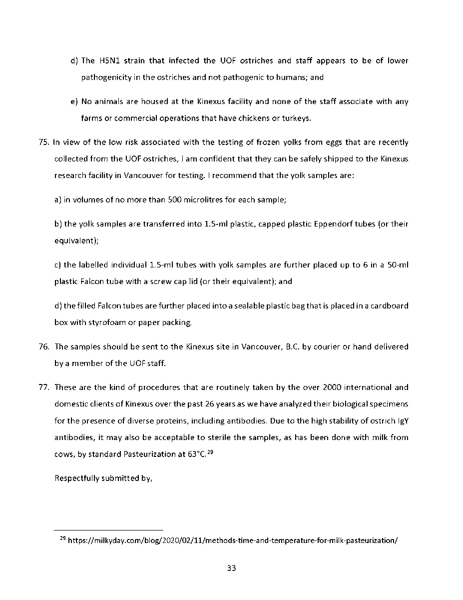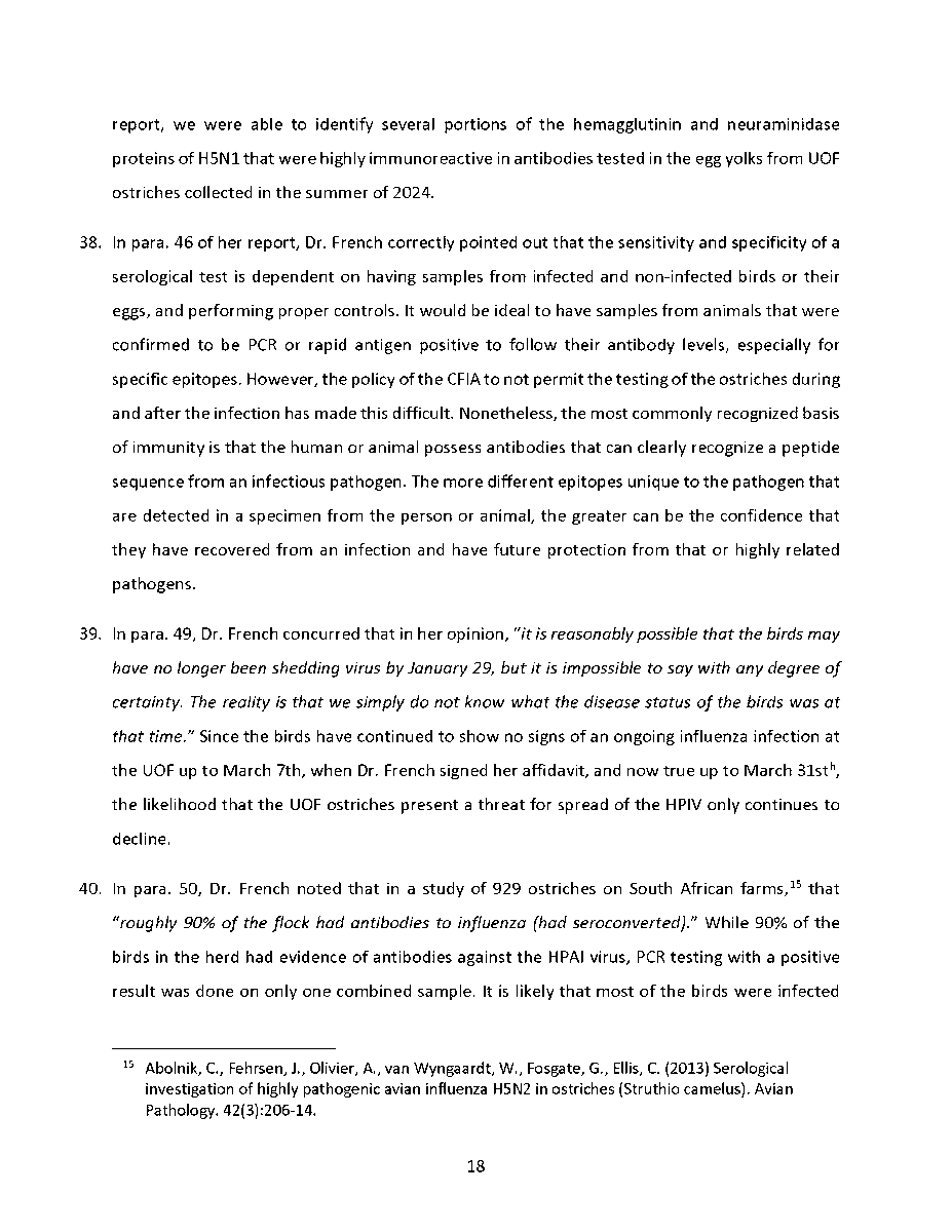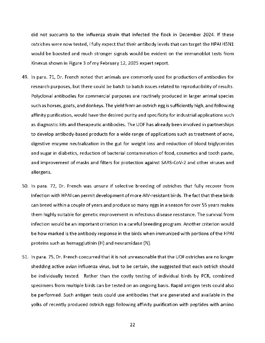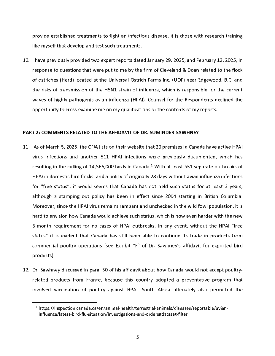 🚨 Universal Ostrich Farm Update: The Evidence the Federal Court Wouldn’t Consider!🚨 Dr. Steven Pelech, a UBC professor with 40 years of experience in immunology, submitted expert testimony demonstrating that the ostriches at Universal Ostrich Farm are healthy, immune, and scientifically valuable. Yet this evidence was denied by the Federal Court. The Birds Are Healthy Dr. Pelech confirmed that the surviving flock is not sick, is not shedding the virus, and is showing strong signs of natural immunity. Confirmed Antibodies He personally tested the eggs from these ostriches and found H5- and N1-specific antibodies in the yolks, proving the birds had recovered and developed immune protection. Research Value Ostrich eggs yield massive amounts of antibodies that can be purified for diagnostics, therapeutics, and even antiviral masks and filters. Dr. Pelech’s report outlined how this flock could advance biomedical science for animals and humans. But the Judge Said No Instead of considering this expert evidence, the Court sided with blanket CFIA policy, ignoring the law’s own provisions that allow treatment, quarantine, or research reservation instead of destruction. The takeaway? These birds are not a threat. They are a once-in-a-generation scientific asset. Culling them is not just cruel, it is a catastrophic loss for science and public health. For complete transparency, the entire 39-page expert report by Dr. Steven Pelech is attached below. Read it yourself and see the evidence the Court refused to consider.