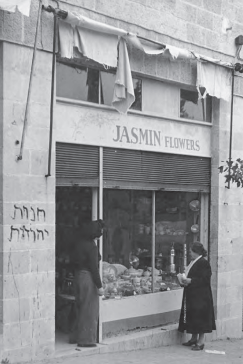 Zionists seizing control of a Palestinian shop in Jerusalem, boldly asserting ownership by spray-painting "a Jewish shop" in Hebrew on the wall, thereby usurping the premises from its expelled owners.