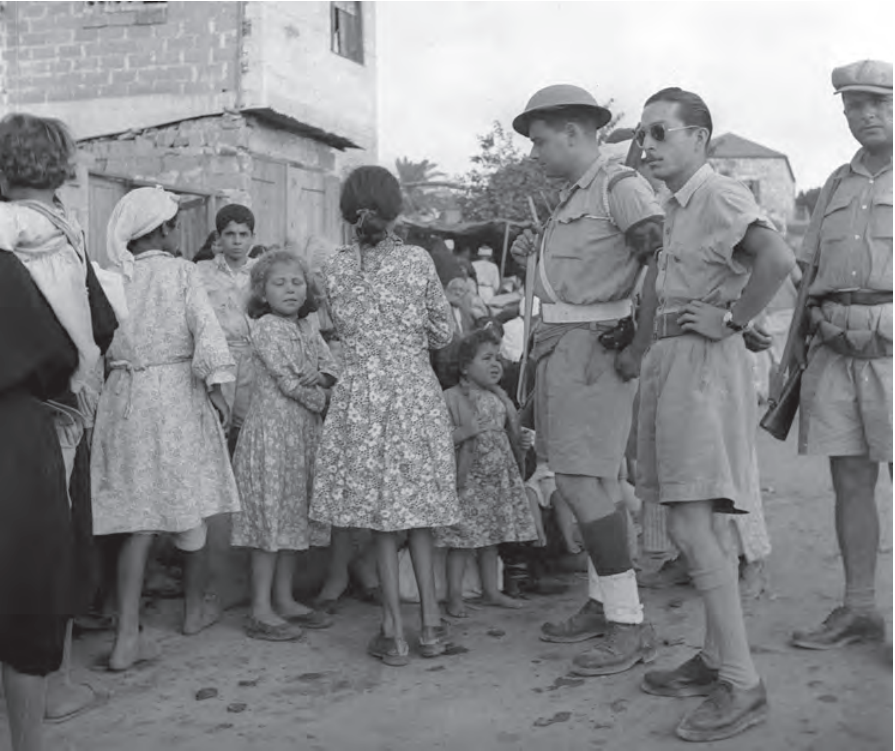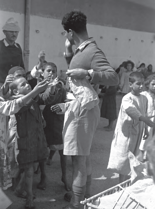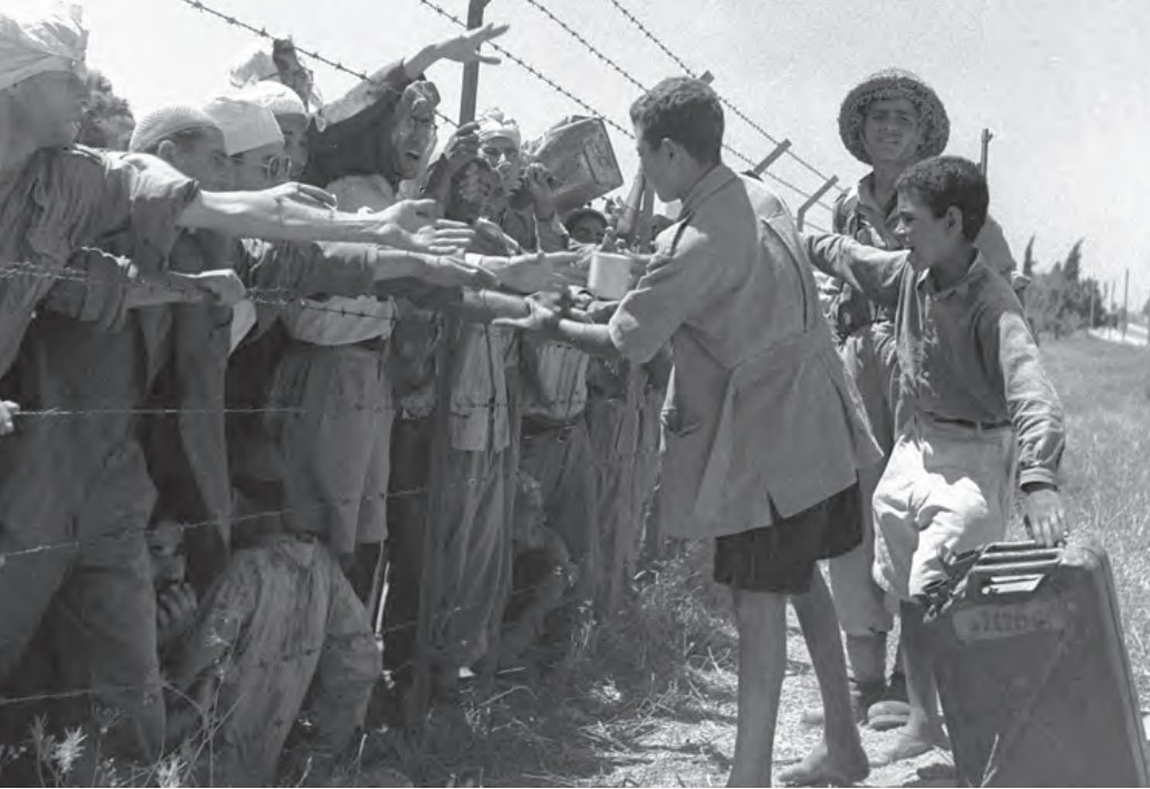 A Zionist soldier with a repulsive colonial attitude distributes food to hungry Palestinian children in Bir al-Sabi'. These children did not know they were about to face expulsion, which would condemn them to a lifetime as refugees.