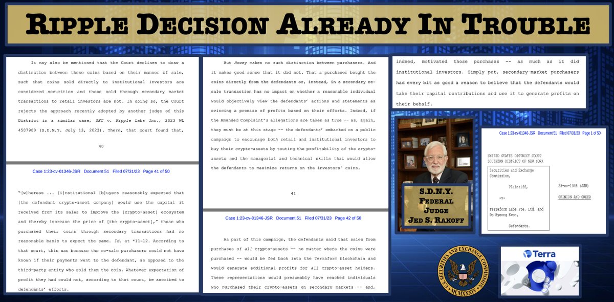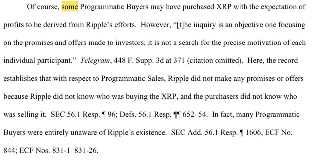 John that quote isn’t compelling nor is it illogical, if applied to specific facts. Judge Torres or Judge Rakoff can’t ignore the issue of PRIVITY - or the lack thereof, in many instances. The bottom line is that there isn’t a single case in history where an investment contract has been found with absolutely no privity between the seller and the buyer. Period. And by prvity I mean some level of contact, communication or business dealings. If it’s a direct sale - there’s contact - a transaction between the two. However, that doesn’t mean direct sales are required before you can have an investment contract. For ex, Ripple sent brochures to 100 investors. If after receiving the brochures some of those investors purchased XRP on Coinbase, not from Ripple, there could still be an investment contract, depending on whether Ripple made promises or caused an objective person to rely on the efforts of others in expecting a profit in those Brochures. The SEC could possibly prove an investment contract existed with those receiving the brochure and then buying XRP. But to argue that all XRP purchased on exchanges by people who never received the brochures or don’t even know Ripple existed would be absurd AND it’s never been done in 80 years of caselaw. As a trial lawyer, you know cases are decided on facts and evidence. In fact, Judge Torres acknowledged that some secondary purchasers MAY have bought XRP relying on Ripple’s efforts but that doesn’t turn all secondary sales into investment contracts. Judge Torres cited ACTUAL EVIDENCE in the case demonstrating many secondary market purchasers were unaware of Ripple as a company. I submitted 3600 XRP holder affidavits showing the majority of first time acquirers of XRP were completely unaware of a company called Ripple. Thousands of people acquired XRP for non-investment reasons, to transfer money on the XRPL or access the DEX. Thousands of vendors accept XRP as payment. In my amicus brief I point out Time Magazine accepted XRP as a form of payment. You know damn well Time Magazine didn’t acquire XRP as an investment, considering it almost immediately sold it for fiat. @TapJets accepts XRP for payment and it allows them to fly on the weekends when the banks are closed because XRP solves that problem. Torres’ decision will be validated because it’s the right result and the SEC couldn’t cite a single case to show otherwise.