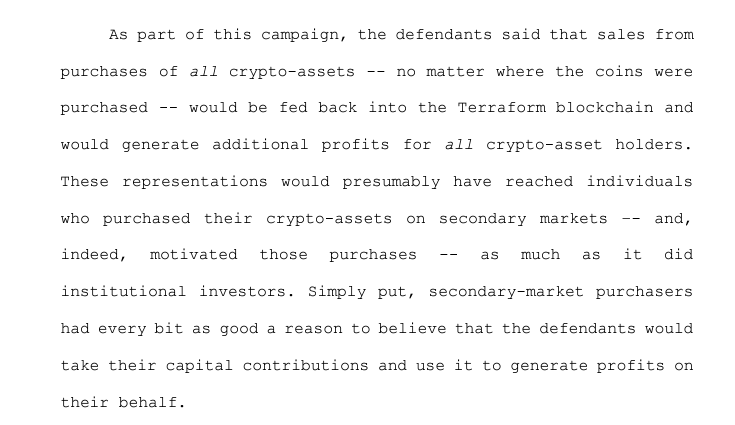The put two another way, the court might be saying that there's no rule that secondary sales need to be treated differently from institutional sales because nothing in the Howey test says so. So if the court did so in Ripple, it was either wrong or did so because the facts in that particular case justified that distinction and the court thinks the facts in this case don't justify such a distinction. Those are my initial impressions anyway, for what it's worth.