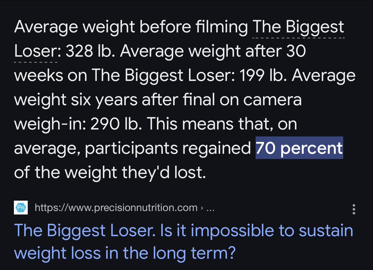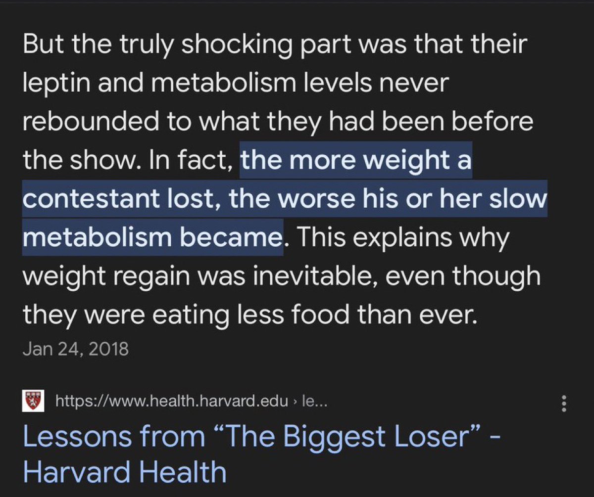 Extreme weight loss like Biggest Loser, Ozempic, or those that do surgical interventions like the lap band; extreme restriction, whether external or internal, the result is less muscle and a destroyed metabolism. Weight is regained and they’re worse off than when they started. https://t.co/quesjoKAfy