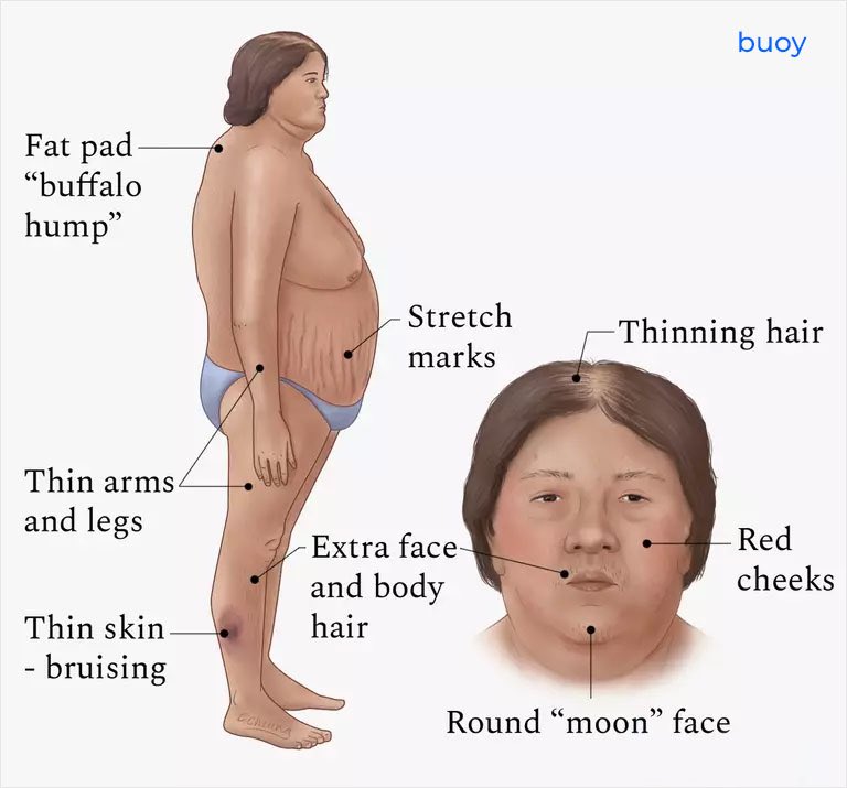 To understand how someone can get fat without eating more, there’s Cushing’s Syndrome - pathological cortisol excess. In this state, the body will start breaking down muscle, bone, skin, even hair, and start depositing all this former healthy tissue as fat across the body. https://t.co/Y1iS41ZxB6
