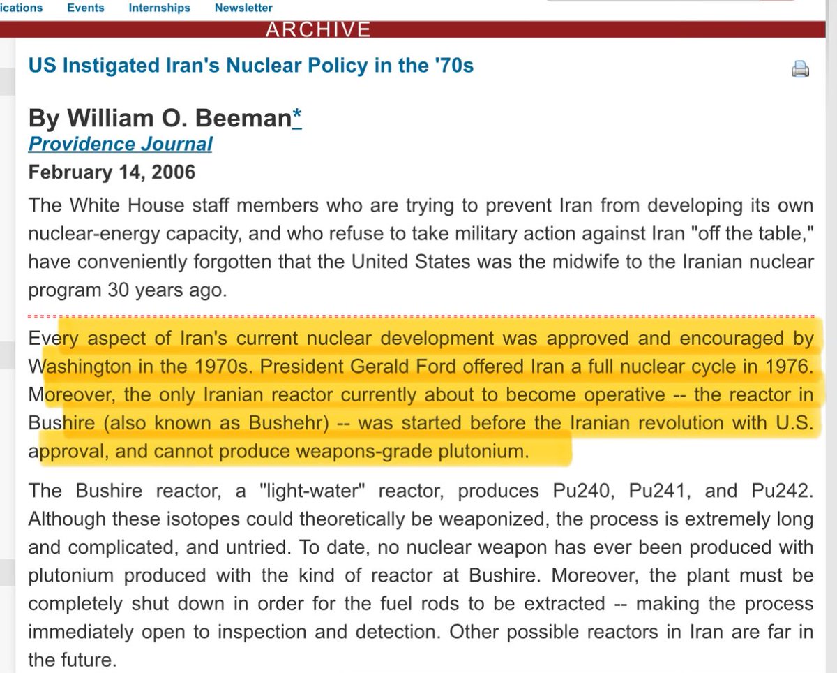 While buttressing proxy forces abroad, Iran also pursued a more controversial insurance policy at home: a nuclear program. Ironically, this effort had begun under the Shah with U.S. encouragement – the American government in the 1970s actively aided the Shah’s plan to build nuclear reactors . After the revolution, those plans were stalled and Iran’s nuclear work was modest. But by the mid-1990s, facing U.S. sanctions and open talk of overthrowing the Islamic Republic, Tehran quietly accelerated nuclear research. Iranian leaders saw what happened to countries without a deterrent – Iraq under Saddam, Libya’s Gaddafi – and drew a lesson that a nuclear capability might ward off foreign attack. Source: https://archive.globalpolicy.org/empire/intervention/iran/general/2006/0214iranhistory.htm