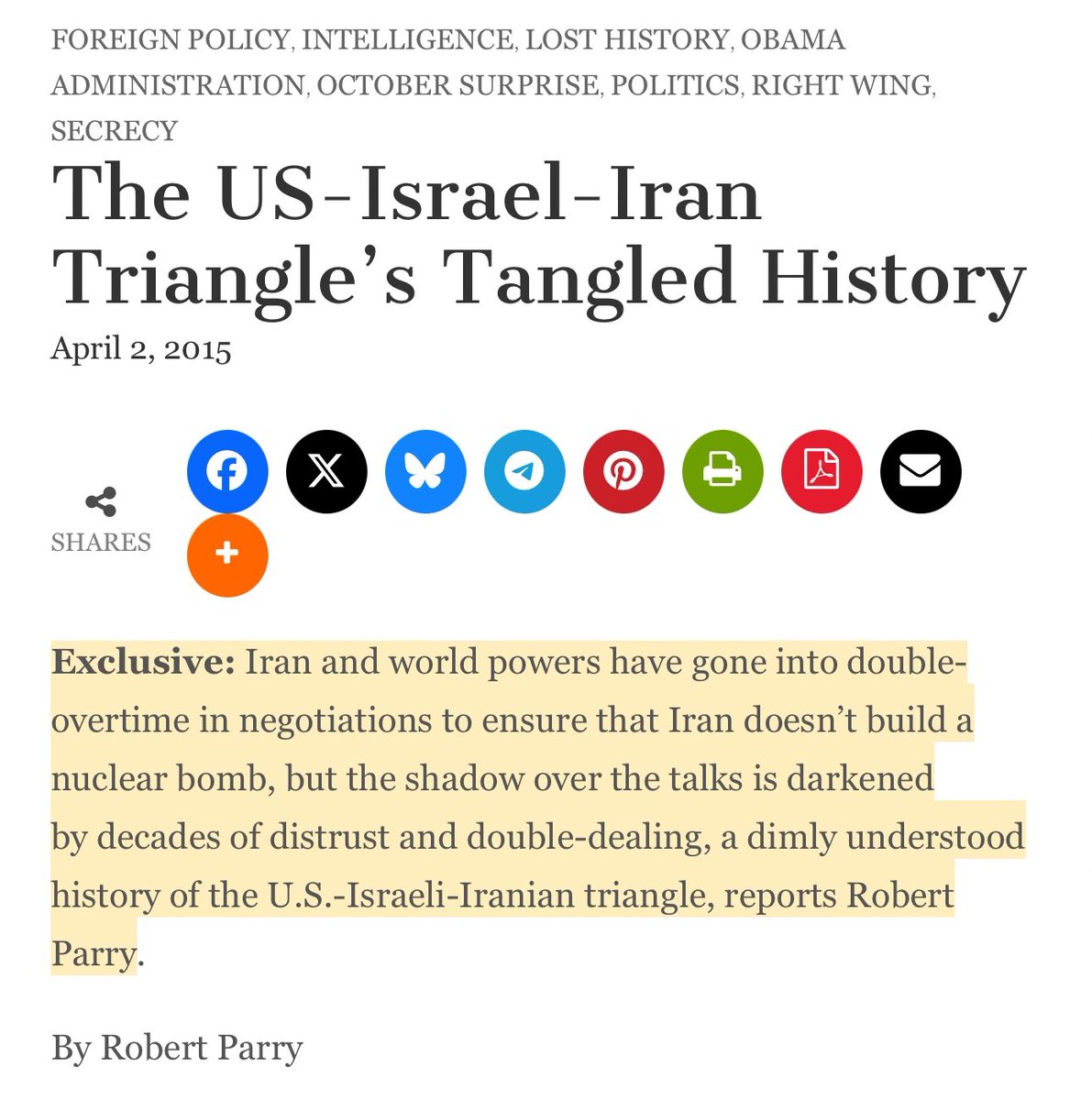 Seven decades after the 1953 coup, the legacy of Western interference still poisons Iran’s relations with the world. The CIA’s toppling of Mossadegh – motivated by oil and geostrategy – set in motion a cascade: an authoritarian Shah, a repressive backlash in the form of an Islamic Revolution, and an enduring climate of mistrust and hostility. Iranians have never forgotten that foreign powers robbed them of self-determination, and hardliners exploit that history to shore up their rule. Likewise, Americans and Israelis scarred by 1979 and security threats see Iran as implacably aggressive. The result is a dangerous standoff – one rooted not in age-old hatred, but in blowback from covert ops and tyranny. A 2017 declassified review by the U.S. government itself concluded that the 1953 coup “poisoned” Iran’s feelings toward the West and fueled the Islamist surge of 1979. Source: https://consortiumnews.com/2015/04/02/the-us-israel-iran-triangles-tangled-history/#:~:text=Exclusive%3A%20Iran%20and%20world%20powers,Iranian%20triangle%2C%20reports%20Robert%20Parry