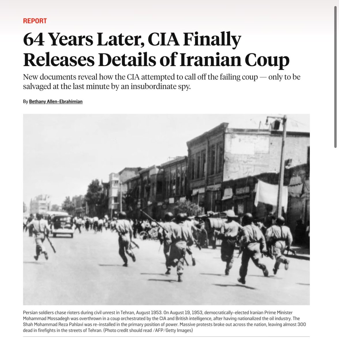 In August 1953, the CIA (led on the ground by Kermit Roosevelt Jr., Theodore Roosevelt’s grandson) and Britain’s MI6 executed the coup (code-named TPAJAX). After an initial failed attempt, royalist military units aided by CIA-funded mobs succeeded on August 19, 1953, in ousting Mossadegh . The Iranian prime minister’s house was shelled by tanks and crowds ransacked Tehran in coordinated chaos. Nearly 300 people died in street clashes as the coup unfolded. Source: https://archive.is/wTpuH