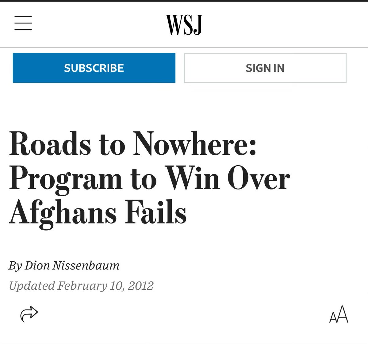 Then came the road-building project: a $317 million effort in southeastern Afghanistan designed to connect villages and create jobs. With 900 miles of road planned, the project became mired in delays, security challenges, and allegations of “kickbacks and bribery.” “Three years and nearly $270 million later, less than 100 miles of gravel road have been completed, according to American officials. More than 125 people were killed and 250 others were wounded in insurgent attacks aimed at derailing the project, USAID said. The agency shut down the road-building effort in December.” Source: https://archive.is/FokRX