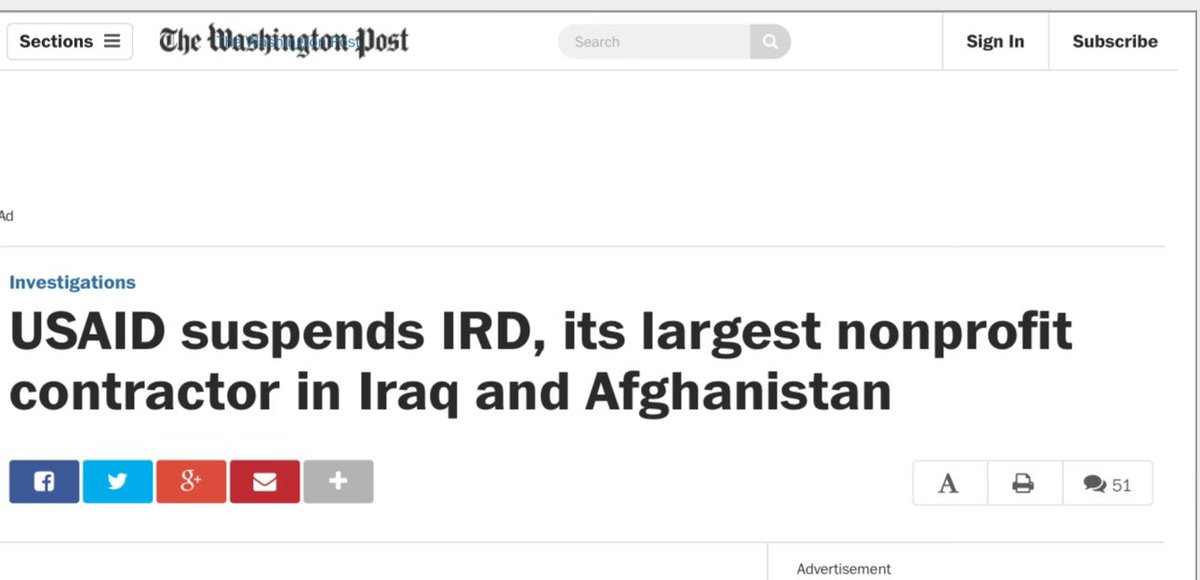 In Afghanistan, IRD’s involvement wasn’t any cleaner. One agricultural program started as a $60 million initiative to boost wheat production and morphed within three years into a $470 million project its impact on stability as murky as the program’s financial trails. “The cooperative agreement was broadened at the urging of the military and Richard C. Holbrooke, the then-special envoy to Afghanistan and Pakistan. It was transformed from one that funded a program that helped farmers grow wheat into one that bought farm tools and paid numerous laborers for a series of small jobs, including the clearing of canals, to help stabilize the southern Helmand and Kandahar provinces of Afghanistan.” USAID news releases lauded the program as an alternative to food handouts and said it was stabilizing those provinces in Afghanistan. But auditors criticized the project, and Eikenberry said it spent too much money and had questionable impact. “Once the decision was made, we threw efficiency out the window,” he recalled. “Some of the districts were awash in cash. The projects were not properly scaled, and they were overly ambitious.” Sources: https://archive.is/757Zb https://2012-2017.usaid.gov/node/50906