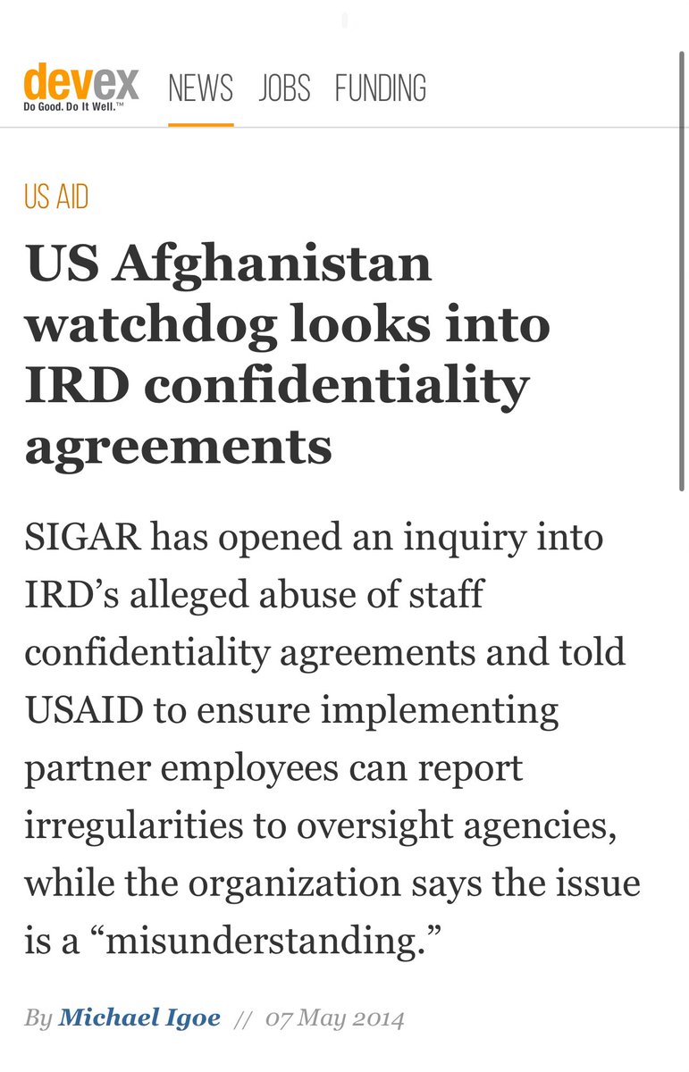 Employees who left IRD were asked to sign confidentiality agreements stipulating that they could be sued for making disparaging remarks about the organization. Such practices potentially violate whistleblower protections and hinder transparency. Source: https://www.devex.com/news/us-afghanistan-watchdog-looks-into-ird-confidentiality-agreements-83435/amp