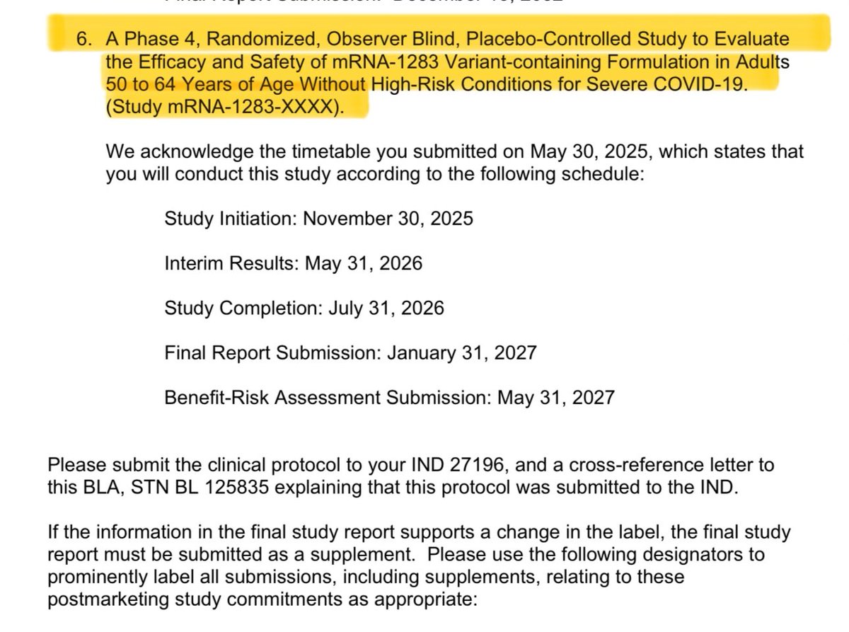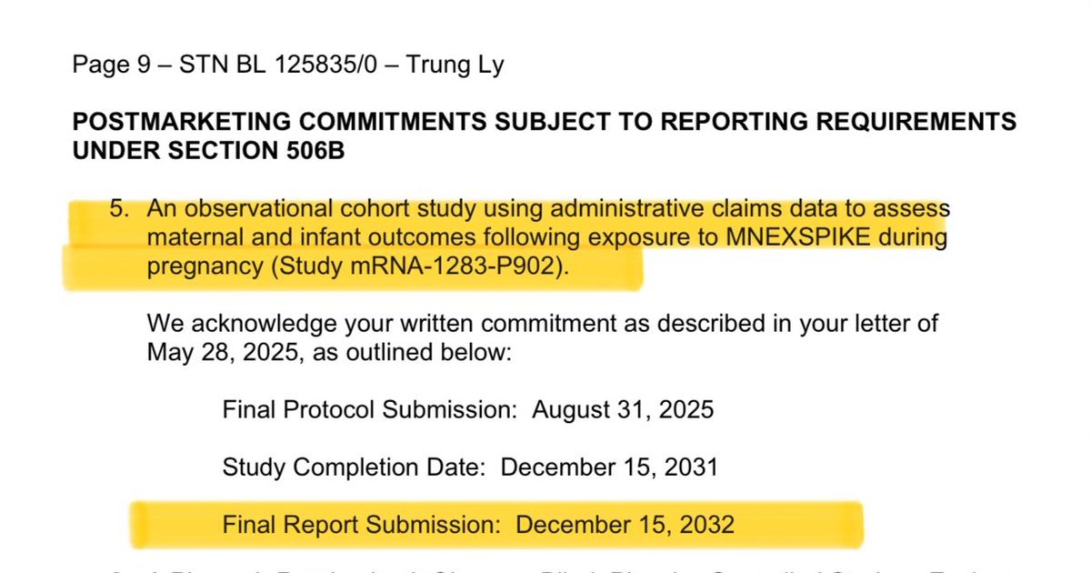 Oh, and they’re requiring Moderna to run more trials after it’s approved. Including one for pregnant women… due in 2032. Yeah. They approved it now, and they’ll figure out if it harms fetuses later. Source: https://www.fda.gov/media/186740/download?attachment https://t.co/ZpMrlqDl16