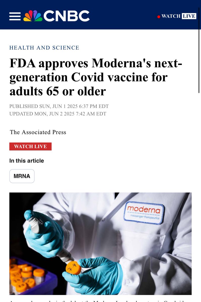 Moderna’s new vaccine, mNEXSPIKE®, was just greenlit by the FDA on May 31, 2025 for Adults 65+ and ages 12–64 with risk factors. According to the FDA, the approval is based on a Phase 3 trial (NCT05815498) with ~11,400 participants. But they didn’t test it against saline. They tested it against Spikevax®, their other COVID shot. Yes, really. Source: https://www.cnbc.com/amp/2025/06/01/fda-approves-modernas-new-lower-dose-covid-19-vaccine.html