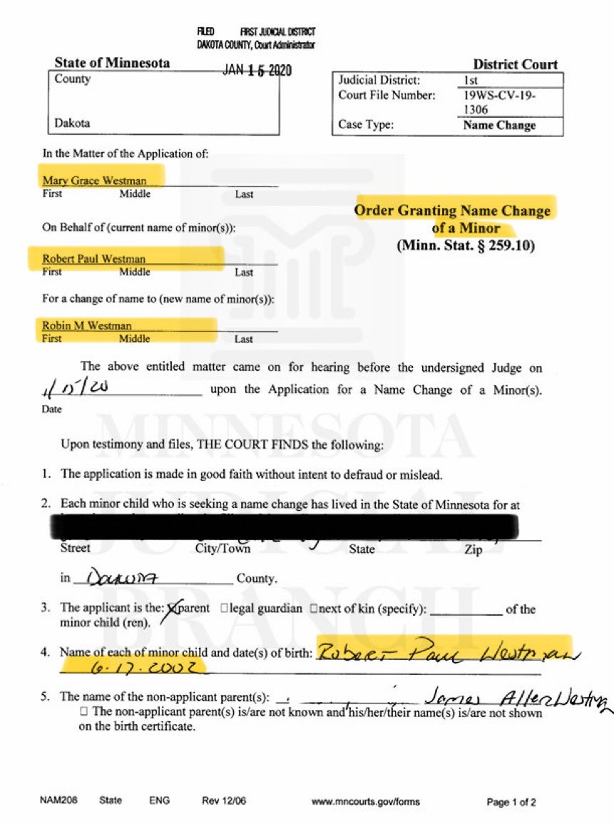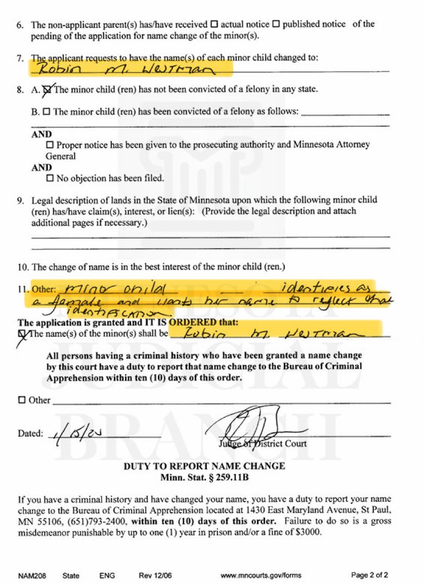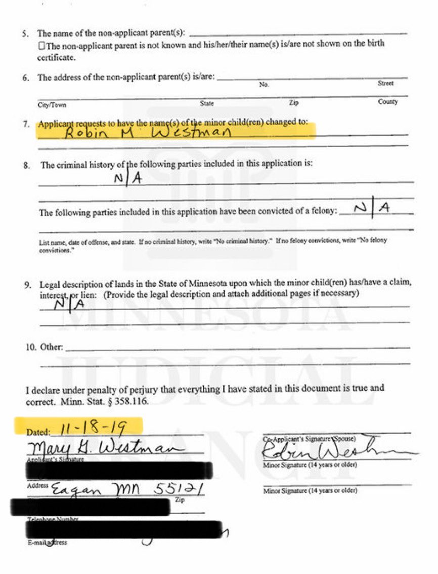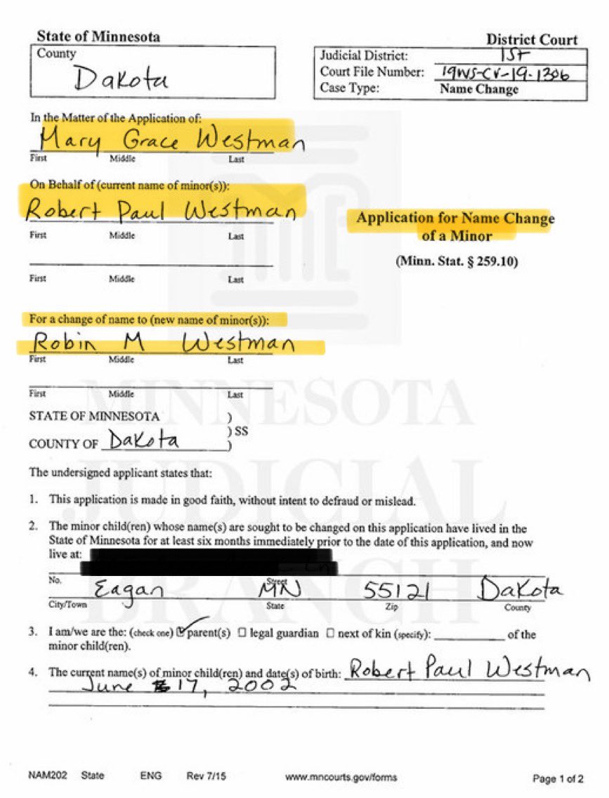BREAKING 🚨🚨🚨 Here is absolute proof that the Minneapolis shooter identified as Transgender. I found a name change request and the order granting the name change from Robert Westman to Robin Westman. Here is the order granting it that clearly says: “Identifies as female”.
