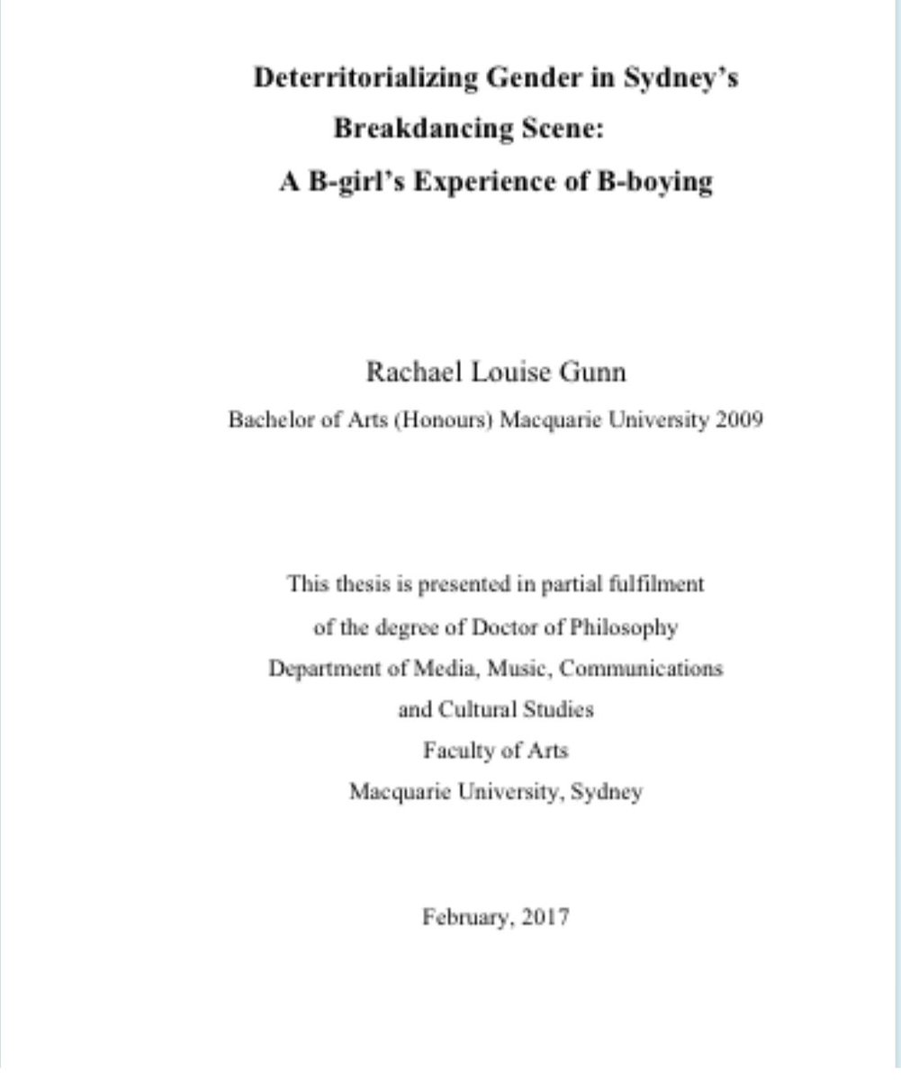 Here is the name of her thesis which earned her a PhD. “Deterritorializing gender in Sydney's breakdancing scene: a B-girl's experience of B-boying” You literally couldn’t make this shit up if you tried. Read the abstract 😂 You can download the entire thing here if you are looking to lower you IQ: https://figshare.mq.edu.au/articles/thesis/Deterritorializing_gender_in_Sydney_s_breakdancing_scene_a_B-girl_s_experience_of_B-boying/19433291?file=34528847