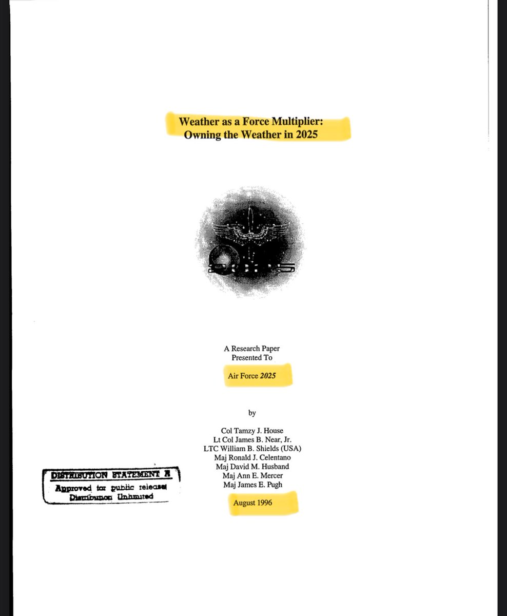 If you think she I lying about the 2025 statement, I found a 1996 USAF document called: “Weather as a Force Multiplier: Owning the Weather in 2025” It lays out “scenarios” in which this technology will potentially be used in the future to modify weather worldwide for various purposes. You can read it in full here: https://apps.dtic.mil/sti/pdfs/ADA333462.pdf