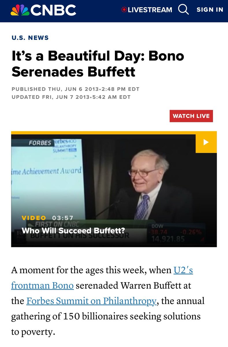 Beyond Gates, Bono maintains documented relationships with other members of the global billionaire class. His friendship with Warren Buffett, demonstrated through his 2013 serenade performance at the Forbes Summit on Philanthropy, illustrates his integration into elite philanthropic circles. The summit itself, attended by "150 billionaires, near-billionaires, philanthropists and leading social entrepreneurs," represents the kind of exclusive gathering where policy directions are often informally coordinated. Source: https://www.cnbc.com/2013/06/06/its-a-beautiful-day-bono-serenades-buffett.html?