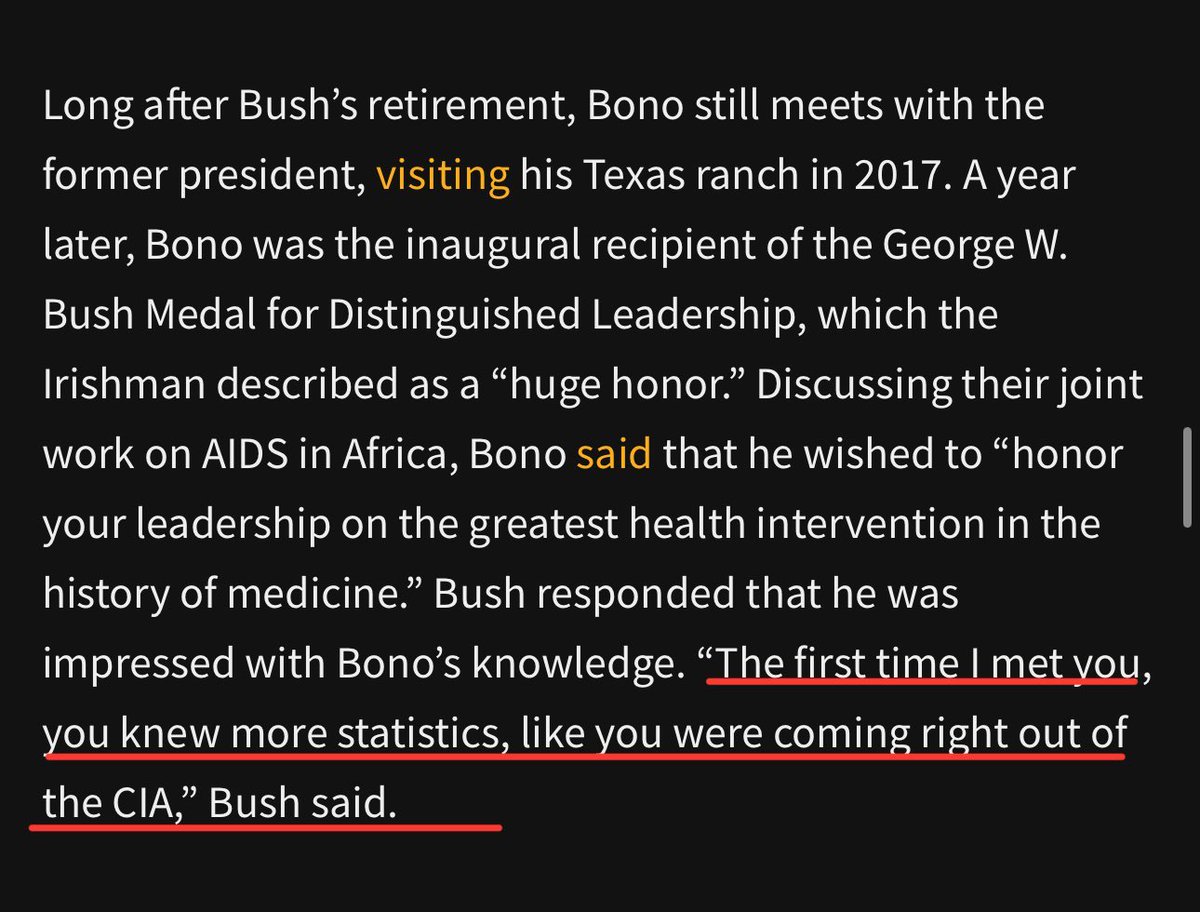 Bush was quoted as saying to Bono: “The first time I met you, you knew more statistics, like you were coming right out of the CIA.” What an odd thing to say George.🤔 Source: mintpressnews.com/frontman-empir…