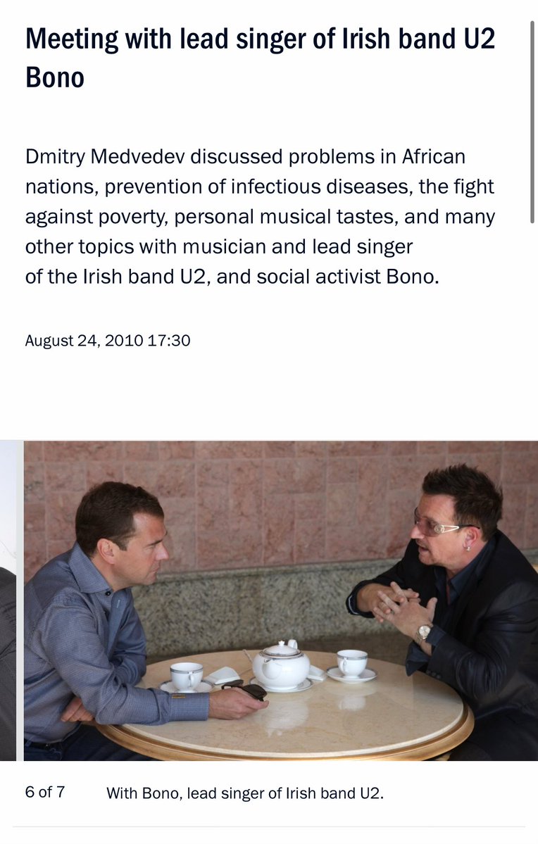 One of the most revealing meetings is Bono's 2010 rendezvous with Russian President Dmitry Medvedev at the president's Sochi residence. During this encounter, conducted in "an informal setting," Medvedev praised Bono's "social activity" and noted that "caring about people is not only the job of politicians". You know because Russian politicians are so well known for their caring nature. Bono's response emphasized his role as "a student of Russia" and his interest in Russian "leadership on tackling some of the great problems in the world". A messianic complex of I’ve ever seen one. Source: https://en.kremlin.ru/events/president/news/8731?