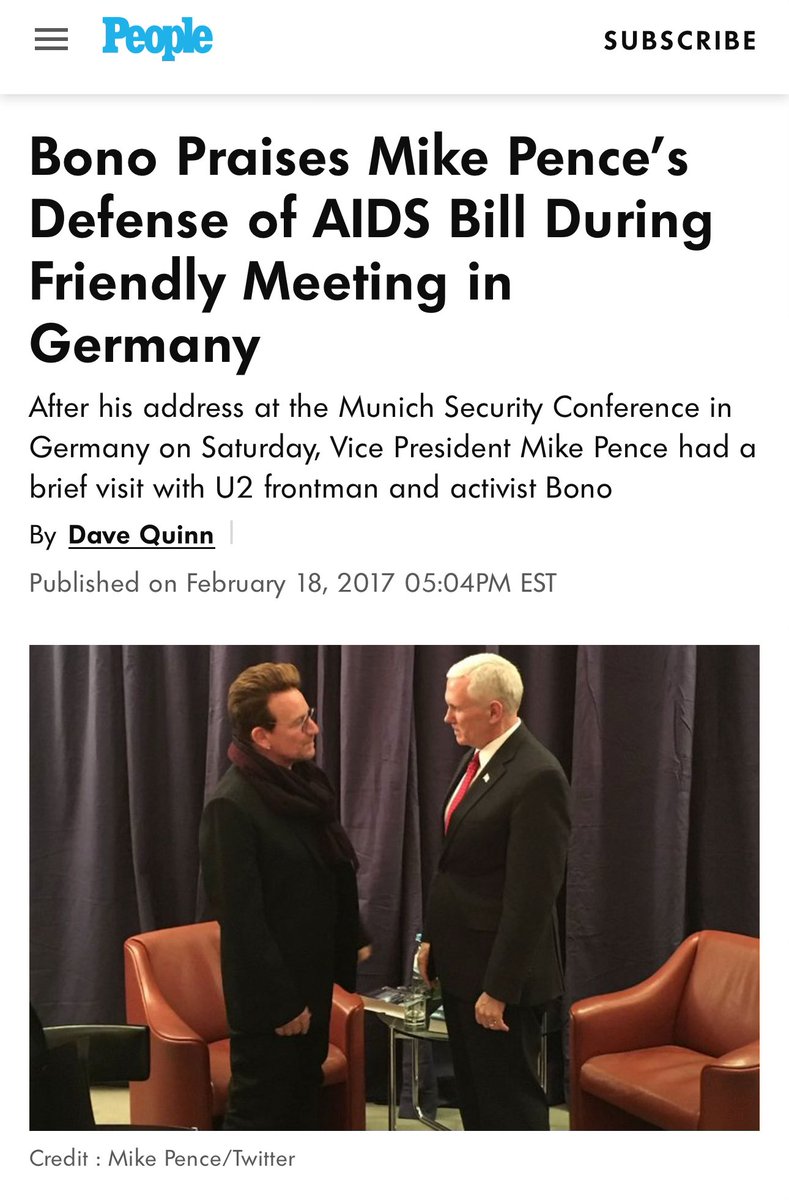 The 2018 meeting with Vice President Mike Pence in Munich further demonstrates Bono's continued access to senior U.S. officials across different administrations. Source: https://people.com/politics/vice-president-mike-pence-meets-bono-munich-security-conference/