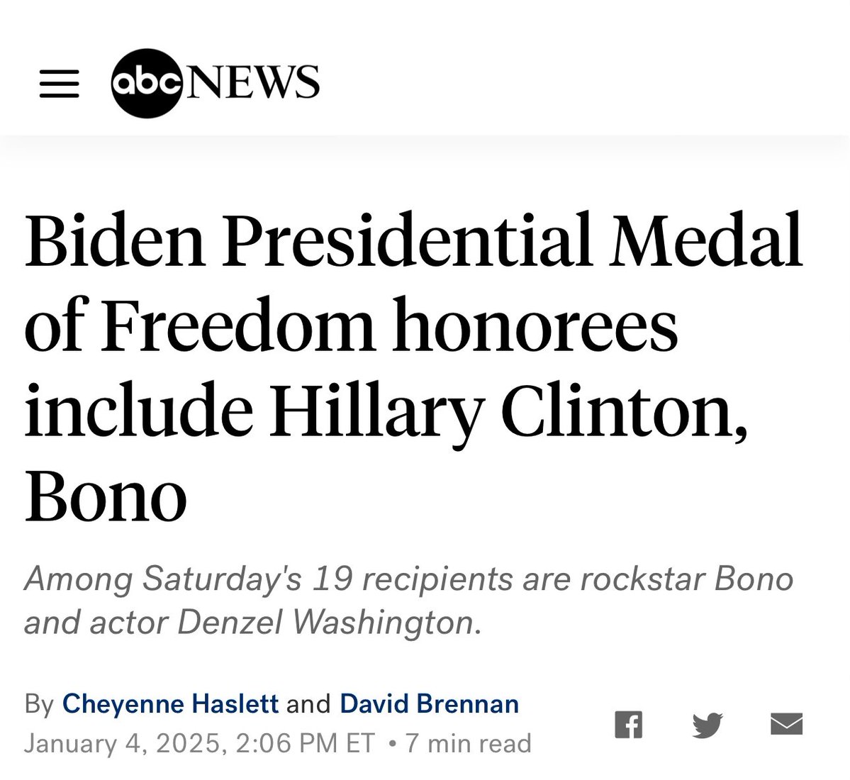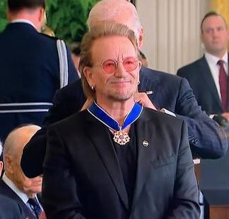 To top it all off, the January 2025 announcement that Bono would receive the Presidential Medal of Freedom from President Biden represents the highest level of U.S. government recognition for his activities. The medal, awarded to individuals who have made "exemplary contributions to the prosperity, values, or security of the United States, world peace, or other significant societal, public or private endeavors," explicitly acknowledges Bono's contribution to U.S. security interests. Source: https://abcnews.go.com/amp/Politics/biden-presidential-medal-freedom-honorees-include-hillary-clinton/story?id=117325468
