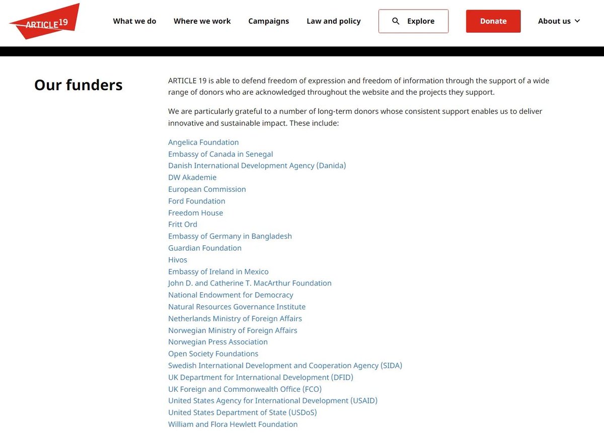 Here are the funders of Article 19, you get the idea: https://www.article19.org/financials/