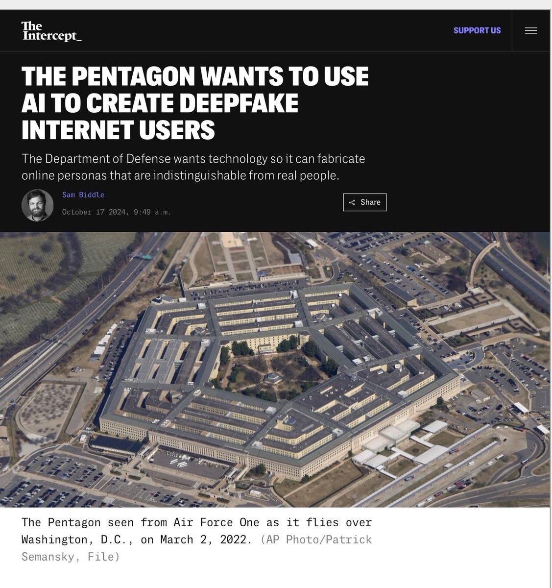 Now why would the Pentagon want to “create deepfake internet users”? Wouldn’t that be “misinformation” and a “threat to our democracy”? The answer is, yes it would, and that’s the entire point with these ghouls. https://t.co/CnxHcbc42B