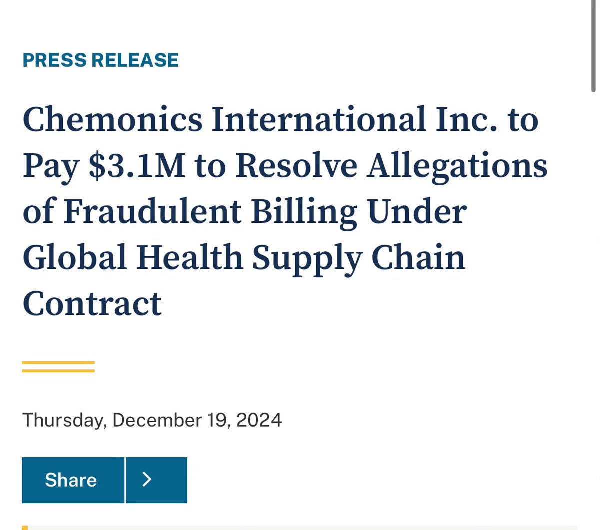 A billion-dollar development contractor wouldn’t be complete without scandals. 1. Fraudulent Billing (2024) Settled a $3.1 million case over reckless oversight. •A subcontractor, Zenith Carex, overbilled USAID in Nigeria. •Classic “we had no idea” defense from Chemonics. https://www.justice.gov/opa/pr/chemonics-international-inc-pay-31m-resolve-allegations-fraudulent-billing-under-global