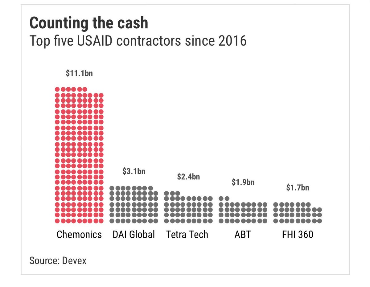 What is Chemonics? A Washington, D.C.-based development firm operating in 100+ countries. Its focus? Health, agriculture, governance, economic development. But its real business? Winning USAID contracts. In 2019 alone, it received $1.5 billion in USAID funding aka taxpayer’s money. https://chemonics.com