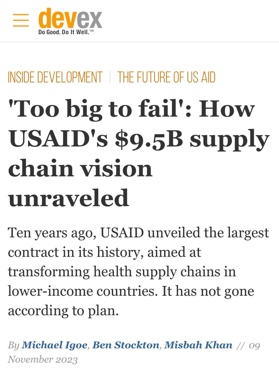 One of its biggest contracts was $9.5 billion of taxpayer money for a Global Health Supply Chain project (2016–2023). The catch? That project became a disaster. “We had procurement analysts who were just making it up,” one former employee said. “We had trash data, and then we had people who didn’t understand how humanitarian aid cargo actually worked. It was a disaster waiting to happen.” https://www.devex.com/news/too-big-to-fail-how-usaid-s-9-5b-supply-chain-vision-unraveled-105141