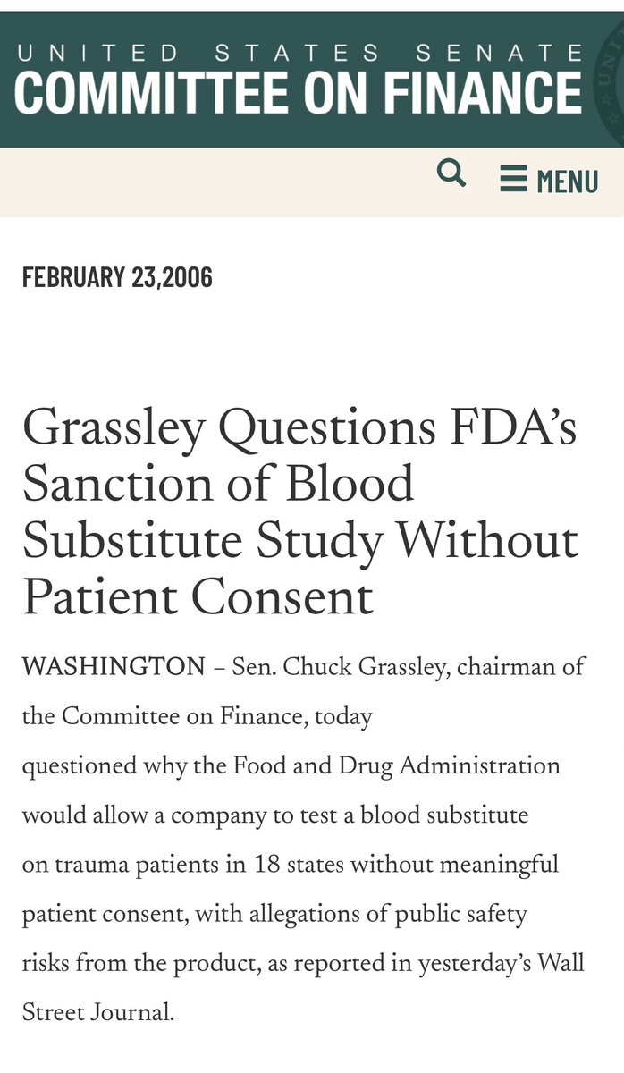 Grassley's letter captured the absurdity perfectly: "No reasonable person would expect to be treated as an experimental subject without consent," yet the FDA had created a system where Americans had to wear "I decline the PolyHeme" wristbands to avoid involuntary enrollment. Full Letter: https://www.finance.senate.gov/chairmans-news/grassley-questions-fdas-sanction-of-blood-substitute-study-without-patient-consent?utm_