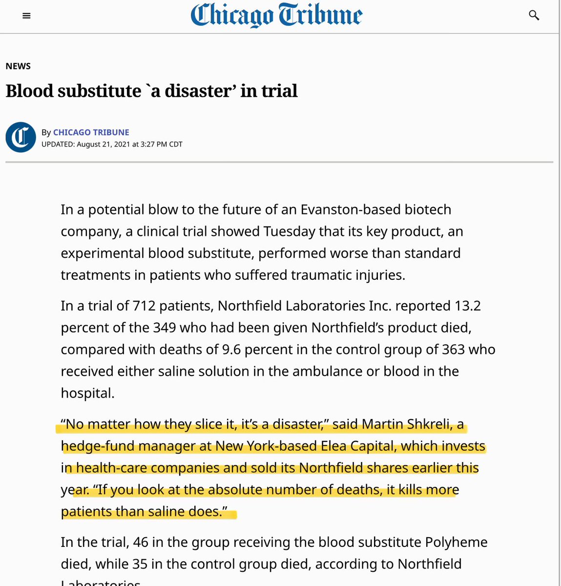 Throughout the controversy, Northfield CEO Dr. Steven Gould doubled down, insisting there was "no attempt at secrecy" and that PolyHeme "didn't cause the heart attacks." The profit motive was clear: after 20 years and $100+ million with no approved products, the company's survival depended on PolyHeme's success. When trial results came in December 2006, they were devastating. The Chicago Tribune headline said it all: "Blood substitute 'a disaster' in trial." 46 of 349 PolyHeme patients died (13.2%) vs. 35 of 363 control patients (9.6%) - 11 MORE deaths in the experimental group. Source: https://archive.is/M9lGX
