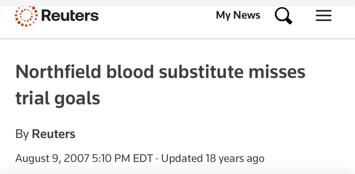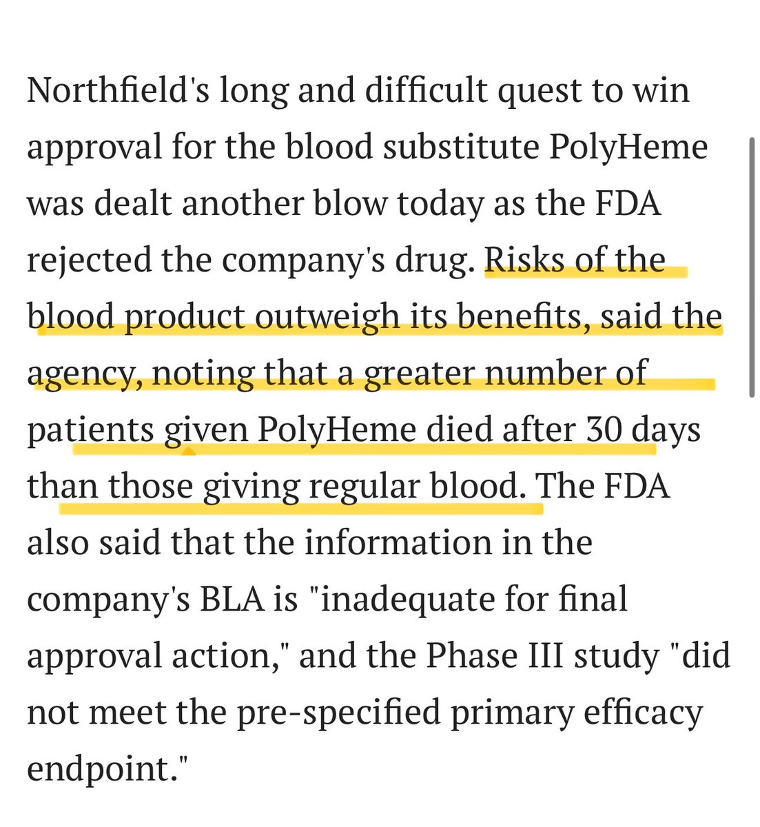 The data showed PolyHeme provided NO survival benefit, didn't significantly reduce blood usage, and was associated with more medical complications including heart attacks. Hundreds of people had been exposed to an experimental product without consent - for nothing. Source: https://www.reuters.com/article/business/healthcare-pharmaceuticals/northfield-blood-substitute-misses-trial-goals-idUSN23185834/#:~:text=Last%20year%2C%20its%20shares%20rallied,or%20target%20unmet%20medical%20needs