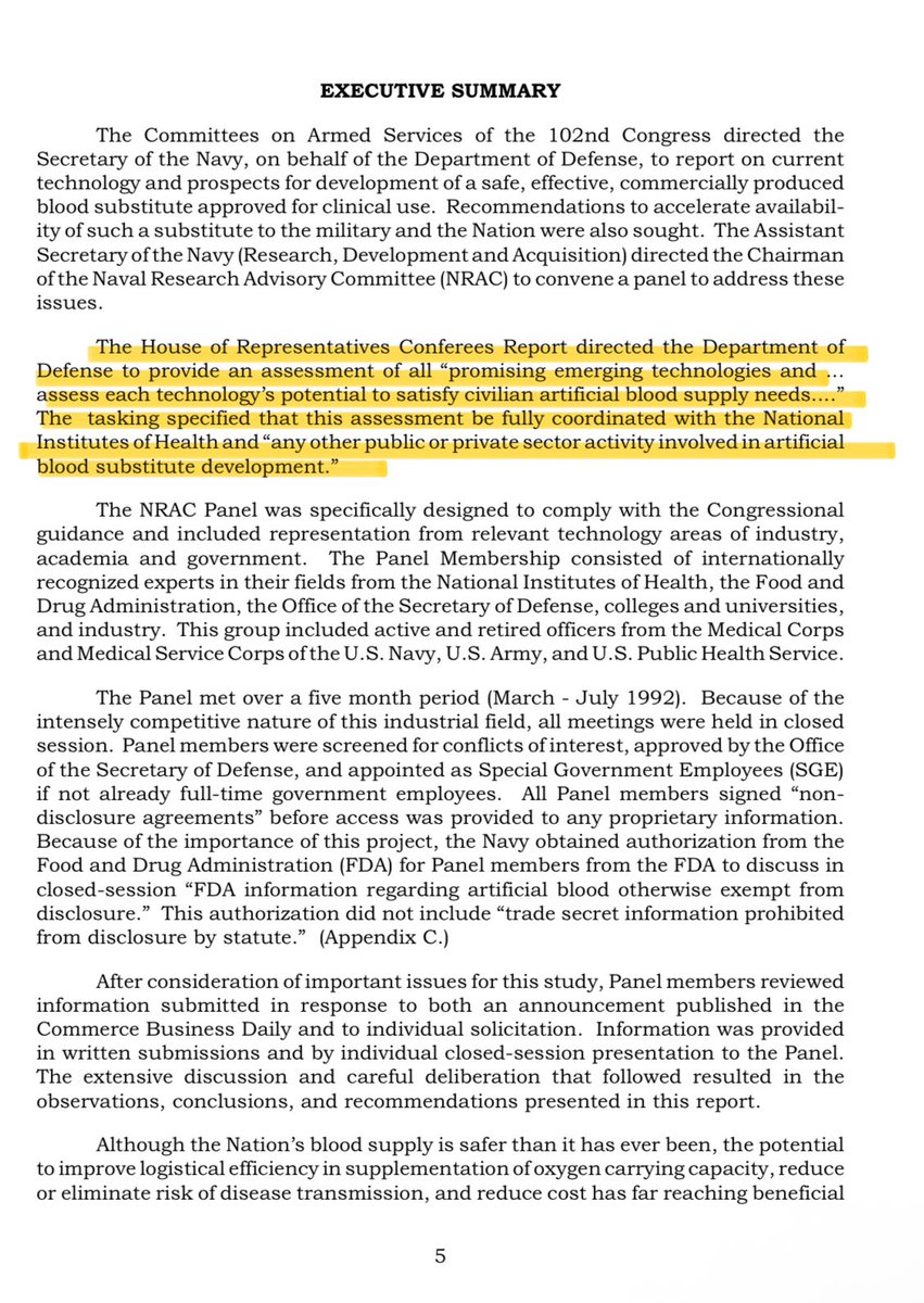 PolyHeme was the Pentagon's dream: a shelf-stable, universal blood substitute that could save soldiers' lives in combat zones where real blood wasn't available. The Department of Defense was so interested they provided funding to support its development, viewing it as a strategic military asset. The 1992 Report of the Pentagons commitment to investing in artificial blood: https://www.onr.navy.mil/media/document/1992rptartificialbloodpdf