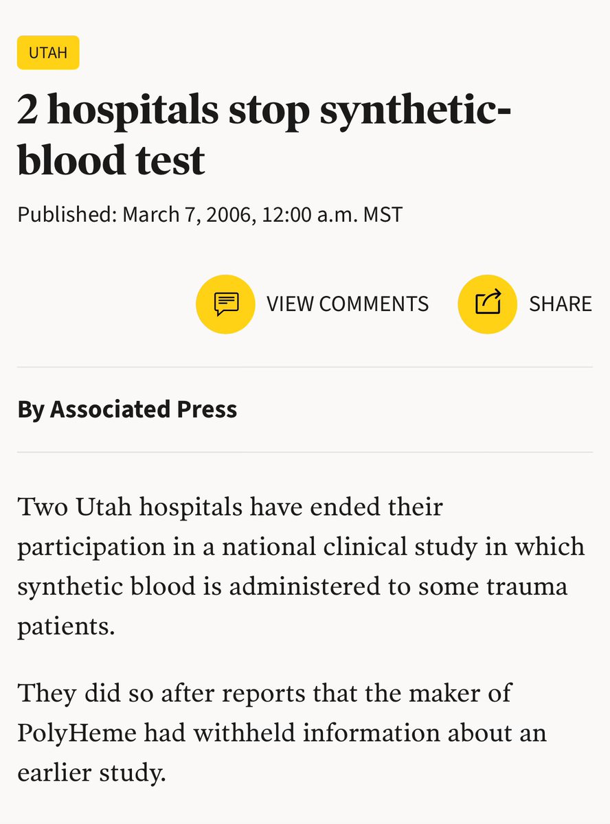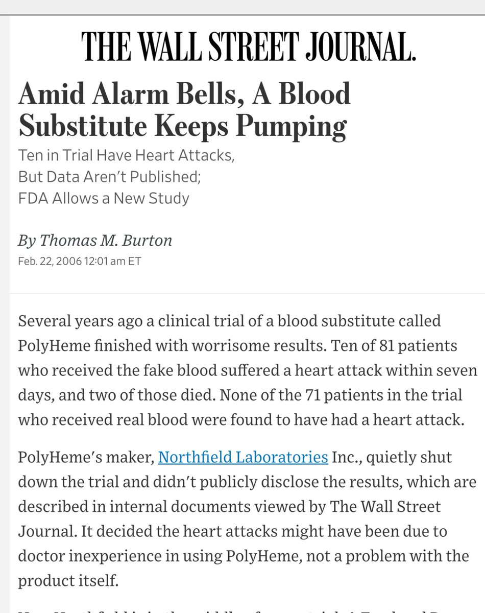 But early trials revealed alarming dangers. In a 1998-2000 study of heart surgery patients, 10 out of 81 people who received PolyHeme suffered heart attacks, and 2 died within a week. The control group given real blood had ZERO such complications. “It halted that study and has not published the full results, but Northfield Chairman Steven Gould said PolyHeme didn't cause the heart attacks or disproportionately more deaths. He said the study was stopped because enrollment was declining and the company wanted to focus on trauma research.” Source: https://www.deseret.com/2006/3/7/19941986/2-hospitals-stop-synthetic-blood-test/#:~:text=Testing%20was%20halted%20Feb,given%20real%20blood%20did%20not
