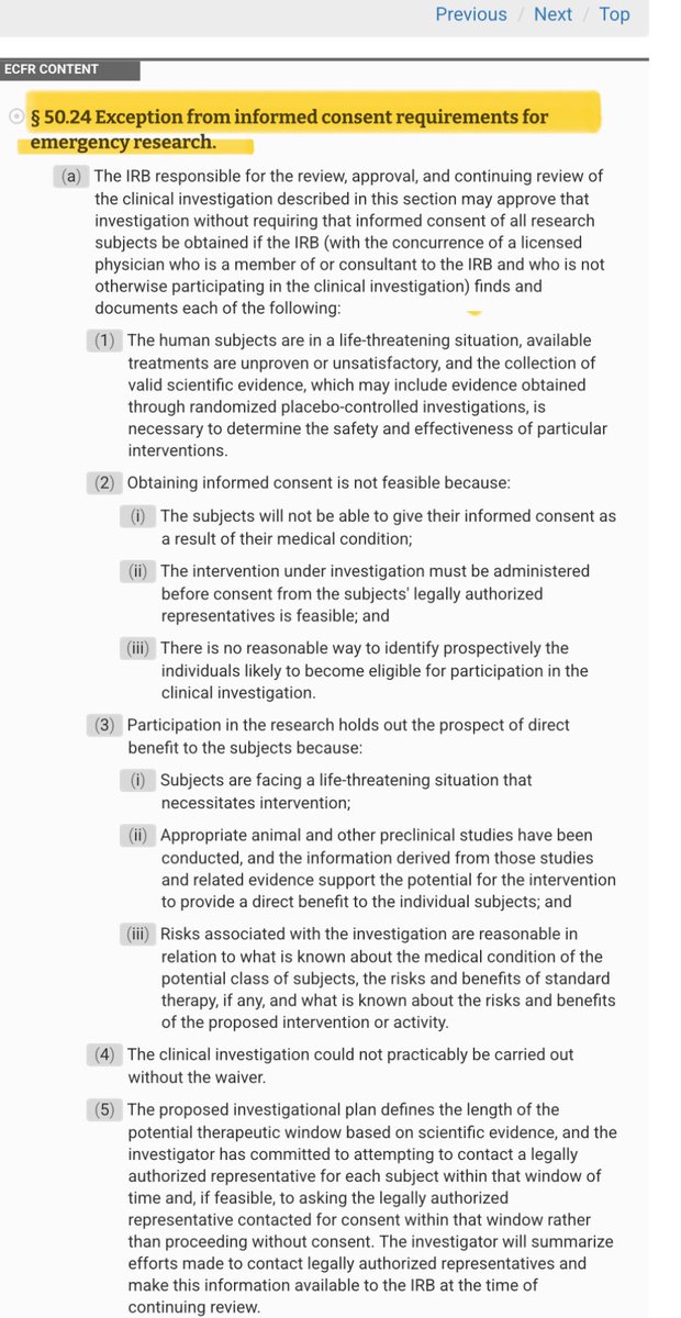 Here's where it gets sinister: Northfield "quietly" halted the trial and chose NOT to publish the full results. Internal FDA memos called the cardiac outcomes "alarming," yet regulators - mindful of Pentagon interests - allowed development to continue. To test PolyHeme on trauma patients, Northfield exploited a little-known FDA loophole: the Exception from Informed Consent (EFIC) rule. This regulation allows research on unconscious patients in emergencies WITHOUT their consent - essentially suspending a core tenet of medical ethics. Here is a link to the Code of Federal Regulations EFIC rule: https://www.ecfr.gov/current/title-21/chapter-I/subchapter-A/part-50/subpart-B/section-50.24