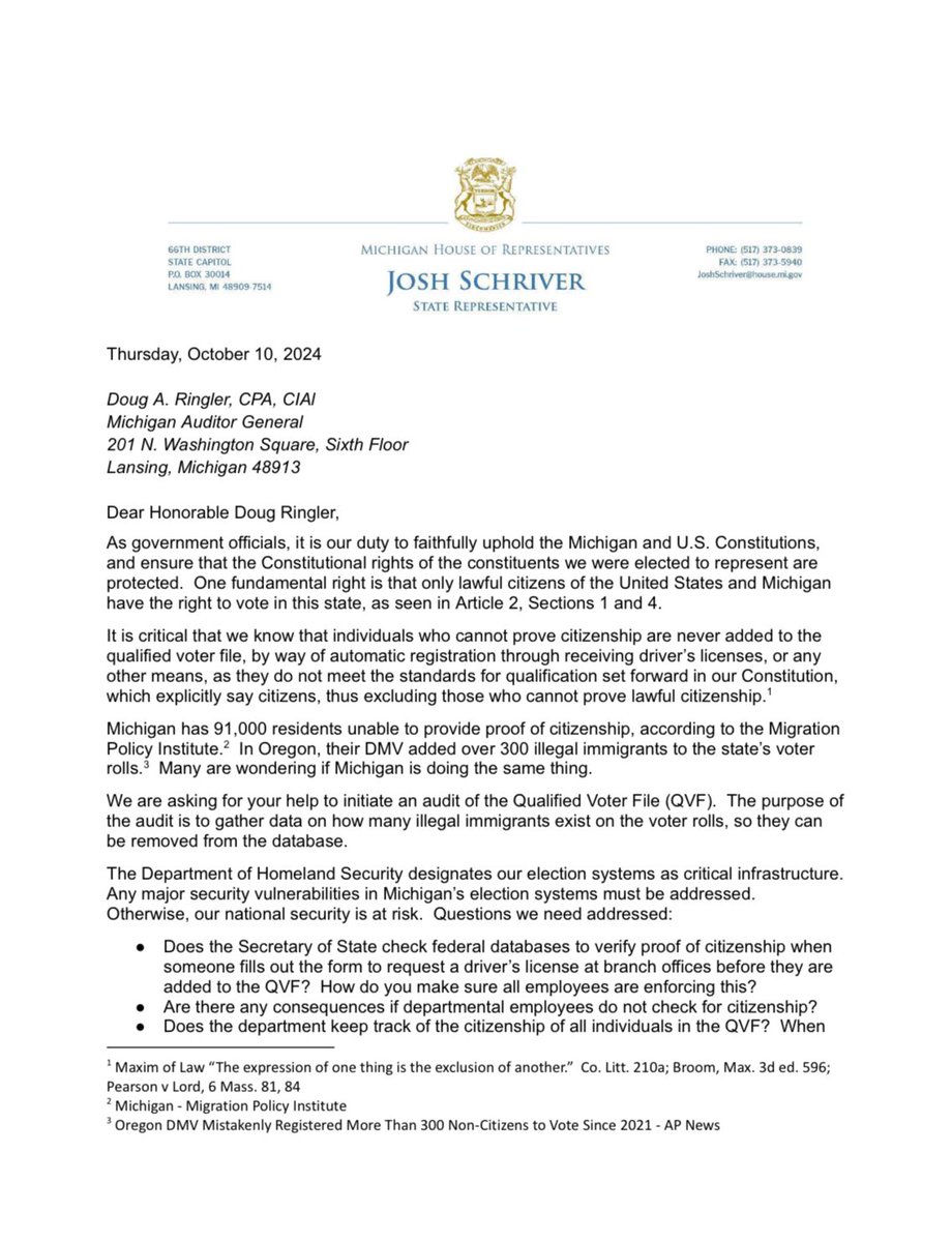 Just got off the phone with the Michigan Secretary of State’s office. They told me they can’t require proof of citizenship for voting because it disenfranchises Americans who can’t provide proof of citizenship. More to come…