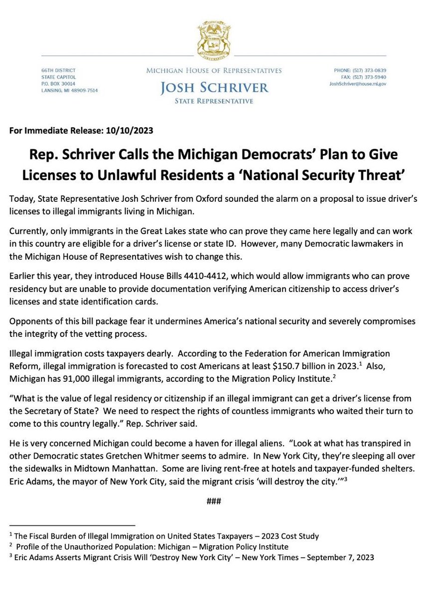 Schriver Archive: October 10, 2023 Whitmer (still) plans to use the Michigan House of Representatives to sneak driver’s licenses into the pockets of illegal immigrants before Christmas Day. Every legitimate Michigan resident, elected official and candidate should speak up to combat this demented effort to replace Americans with foreigners.