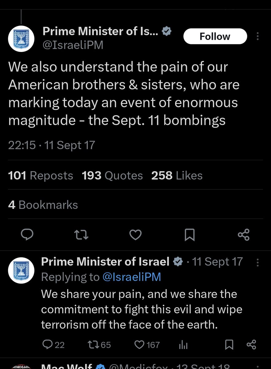Bibi expresses his condolences to American people 16 years after the 9/11 attacks. He also wrote "the Sept. 11 bombings". Just a little Freudian slip here and an admission of what really happened. https://t.co/FbALDW8eR3