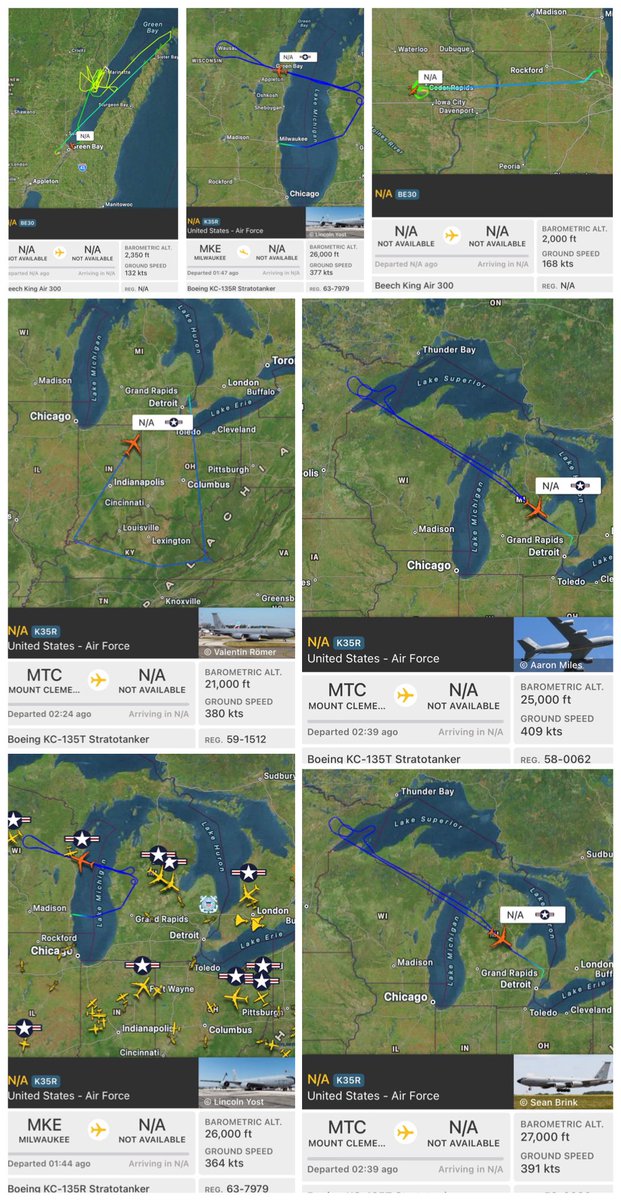 KC-135R out of Milwaukee, again running repeated “refuelling” patterns over the Great Lakes. The frequency is notable, and the routing keeps returning to the same lake corridors and protected land areas almost every day. If the mission is strictly refuelling support, why does the loitering concentrate so often over water and reserve zones rather than staying within more conventional training blocks? What also stands out is that these patterns frequently coincide with King Air aircraft in the same region. King Air platforms are commonly used for reconnaissance, sensor testing, calibration, and atmospheric or navigation data collection. When they appear alongside tanker operations over the same areas, it suggests monitoring or measurement layered on top of refueling activity, rather than unrelated transit flights. I have also seen claims that certain tanker platforms can be configured for atmospheric dispersal or cloud-seeding support. If that capability exists, the recurring pattern and timing are worth tracking, because these flights often appear shortly before significant weather systems move through the region. Aren’t these the lakes where the data centres are going?
