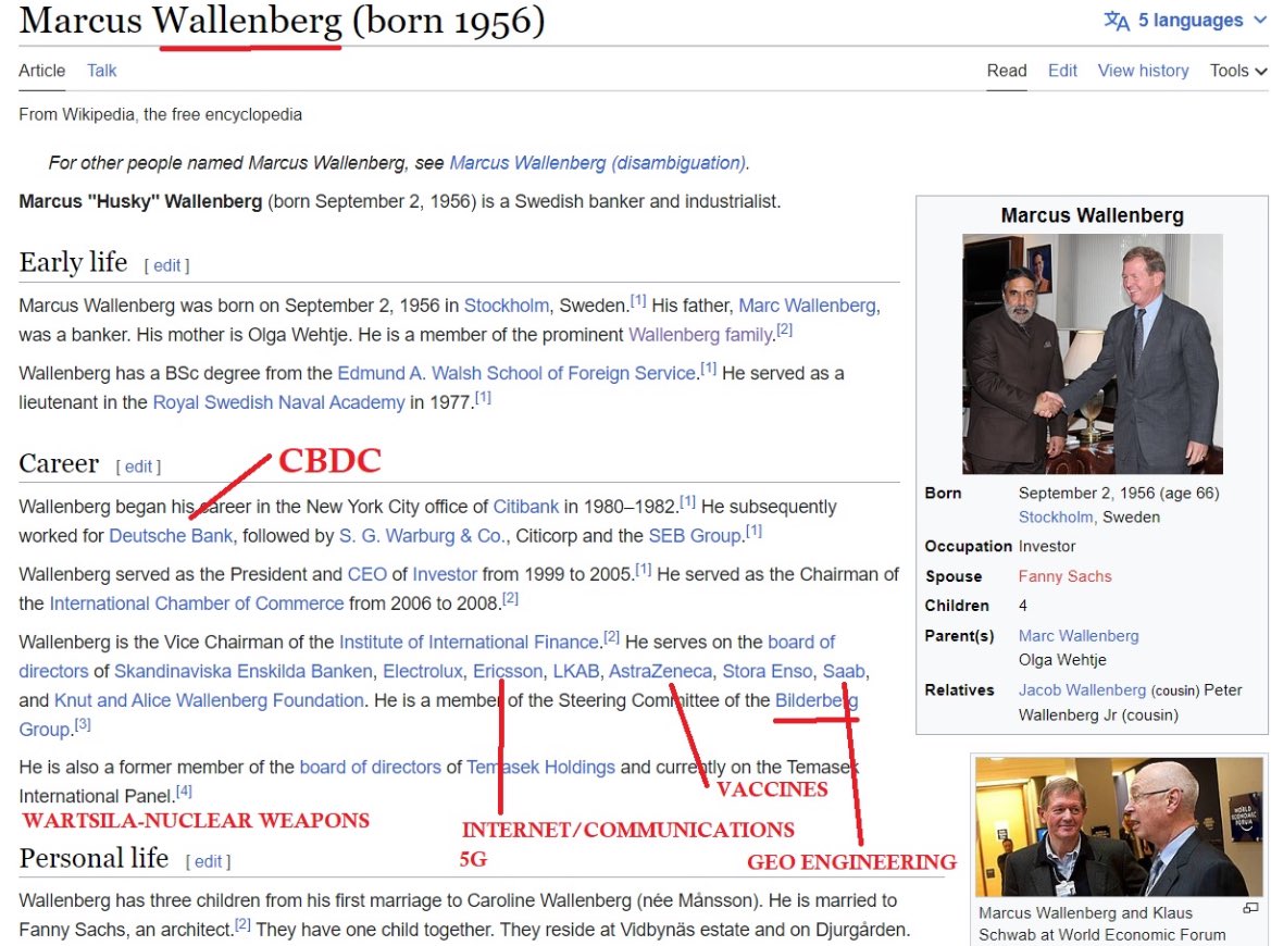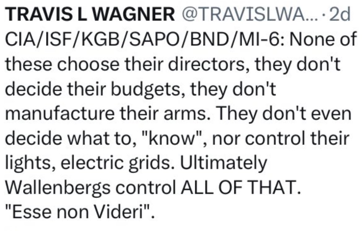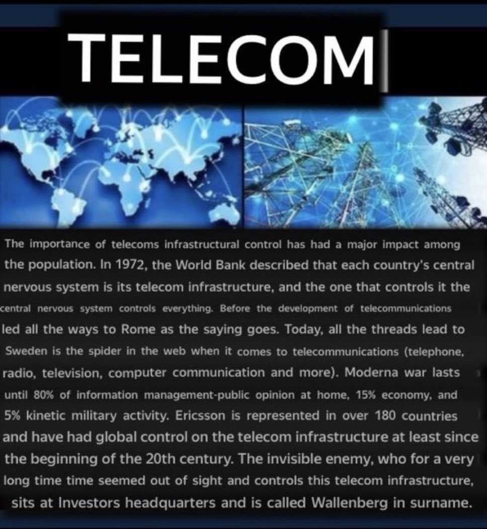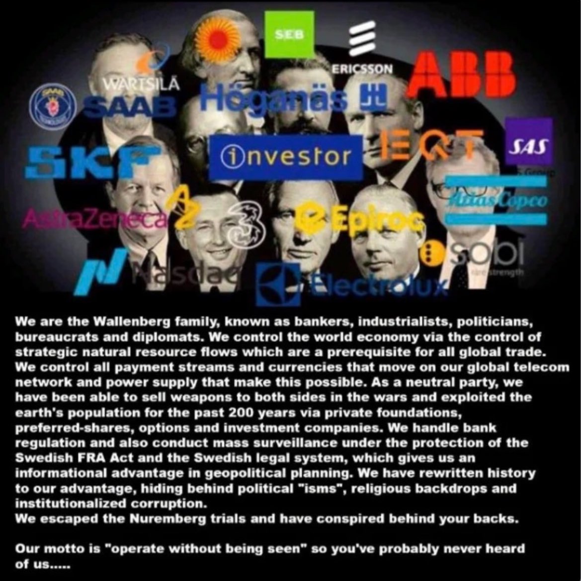 The Wallenberg || Power in the shadows Esse Non Vederi - Act but not be seen 🔲 Wallenbergs have control over 20 conglomerates; a few include: Atlas Copco, ABB, SEB, AstraZeneca, Wärtsilä, Sobi, Saab, Ericsson, Investor AB, and Epiroc. 🔲Jacob & Marcus Wallenberg hosted and co-chaired the most recent Bilderberg Meetings in Stockholm in June 2025. 🔲Wallenberg controls the patent for fiber optics with a built in backdoor, and telecomm for intelligence/ military and police in 187 countries. Including calling 911, Cybertip hotline, and Amber Alert (NCMEC) See: Ericsson Neustar Scandal 🔲Investor AB controls BAE SYSTEMS. Jacob Wallenberg controls investor AB. The Wallenbergs also control Ericsson who finances ISIS/Sinaloa/CJNG, & ABB, (power grids in 150 countries). 🔲Wallenberg’s own Ericsson, and Israel’s Raphael Defense Systems Iron Dome is controlled by Ericsson engineers, as well as Halliburton, who hosts the Iron Dome network.