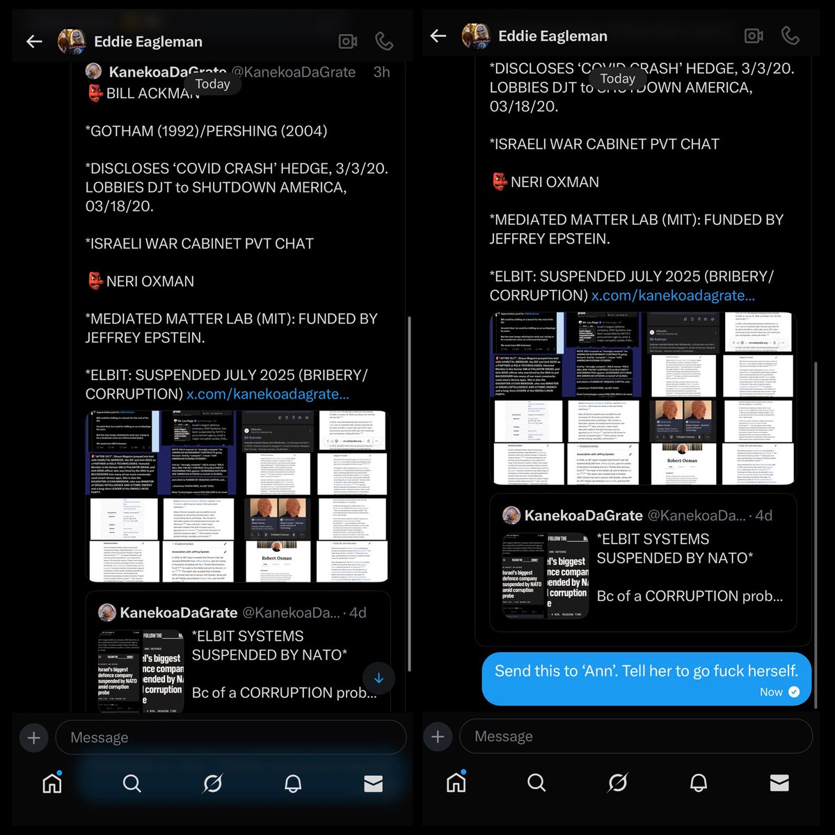👺BILL ACKMAN *GOTHAM (1992)/PERSHING (2004) *DISCLOSES ‘COVID CRASH’ HEDGE, 3/3/20. LOBBIES DJT to SHUTDOWN AMERICA, 03/18/20. *ISRAELI WAR CABINET PVT CHAT 👺NERI OXMAN *MEDIATED MATTER LAB (MIT): FUNDED BY JEFFREY EPSTEIN. *ELBIT: SUSPENDED JULY 2025 (BRIBERY/CORRUPTION) https://t.co/EzzYwpy71u