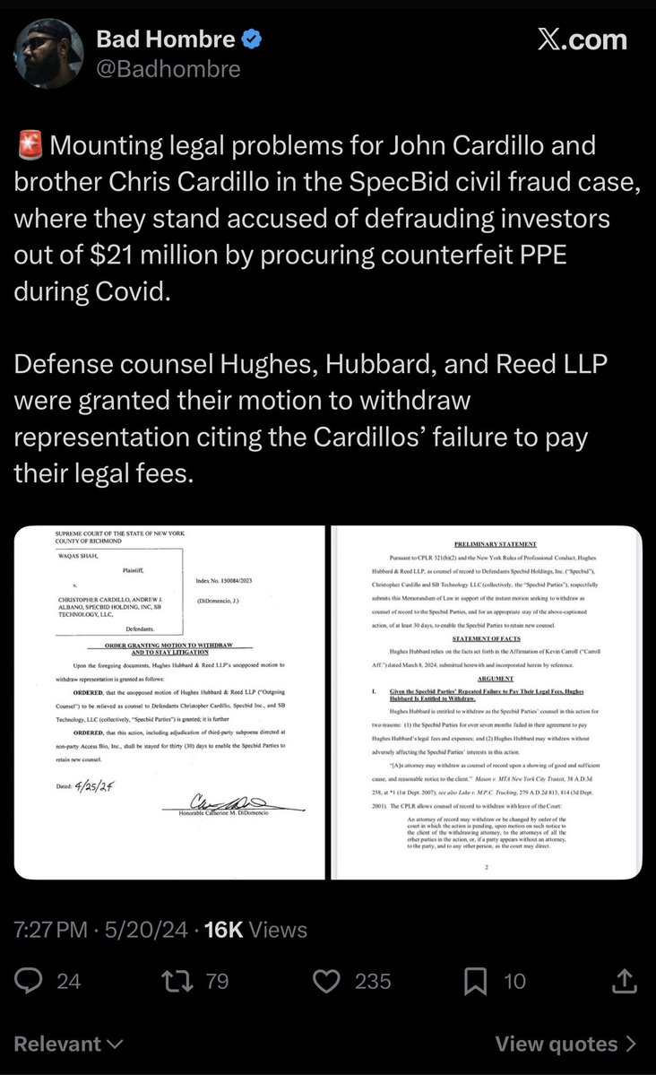 Speaking of stealing, how are the Cardillo brothers doing these days? Is John still an arms dealer *allegedly* stiffing Ukraine on hundreds of thousands of dollars-worth of body armor? Or are he and Chris just focused on skating the PPE fraud scam they ran during the pandemic? https://t.co/9xaw9Ly8dC