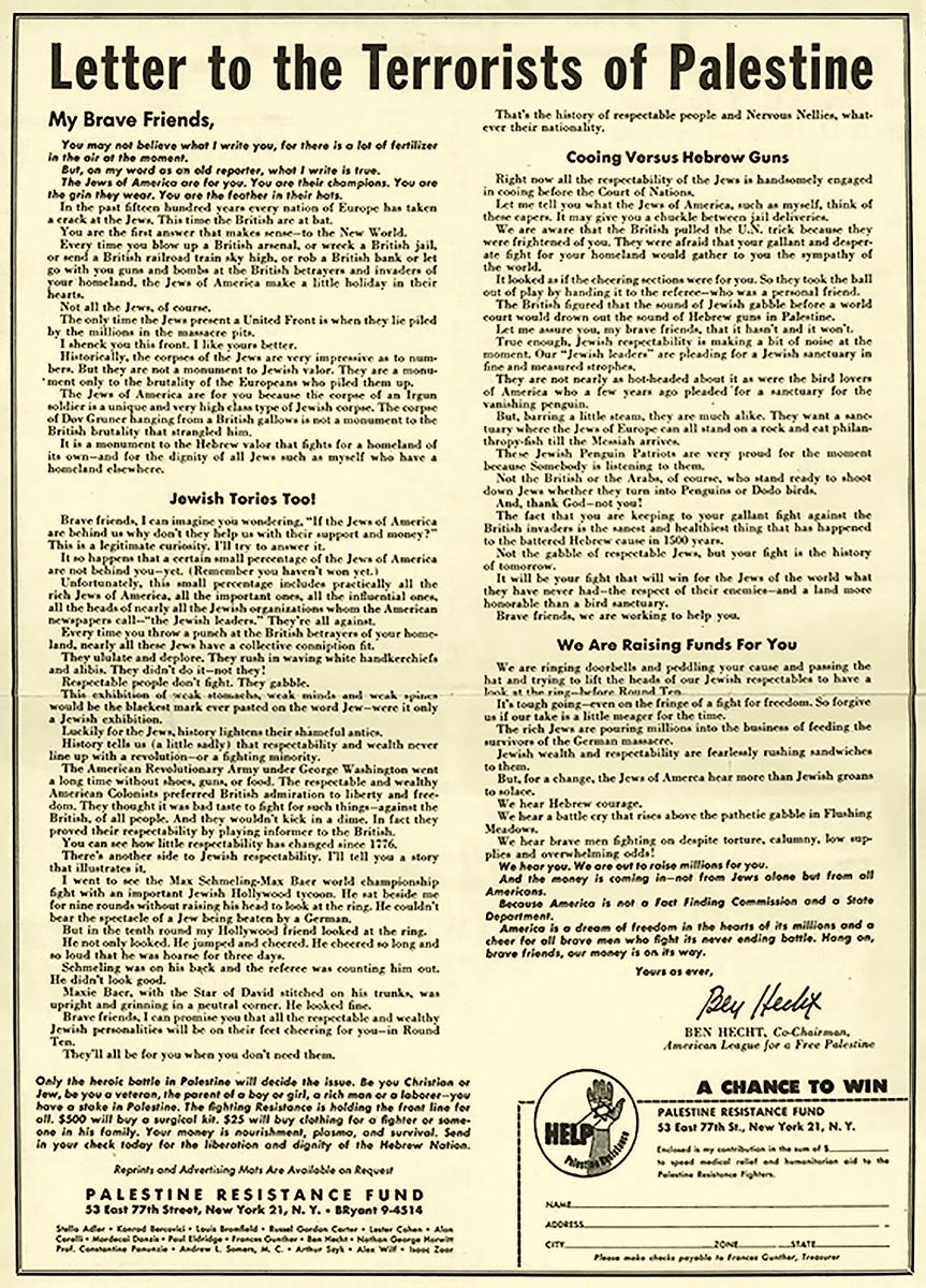Ironically, Ben Hecht was the chairman of a “FREE PALESTINE” group!!! Here’s the ad he purchased on newspapers. And he means the British by “terrorists of Palestine”! https://t.co/T4mlMppZ7Q