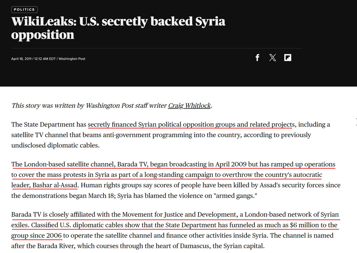 Under George W. Bush, the US secretly recruited and funded opposition leaders in Syria. But Assad kept winning elections. Later, US State Dept. gave millions of dollars to establish a TV station ("Barada TV") to broadcast anti-Assad propaganda within Syria. #Wikileaks https://t.co/Kis8SNXnGh
